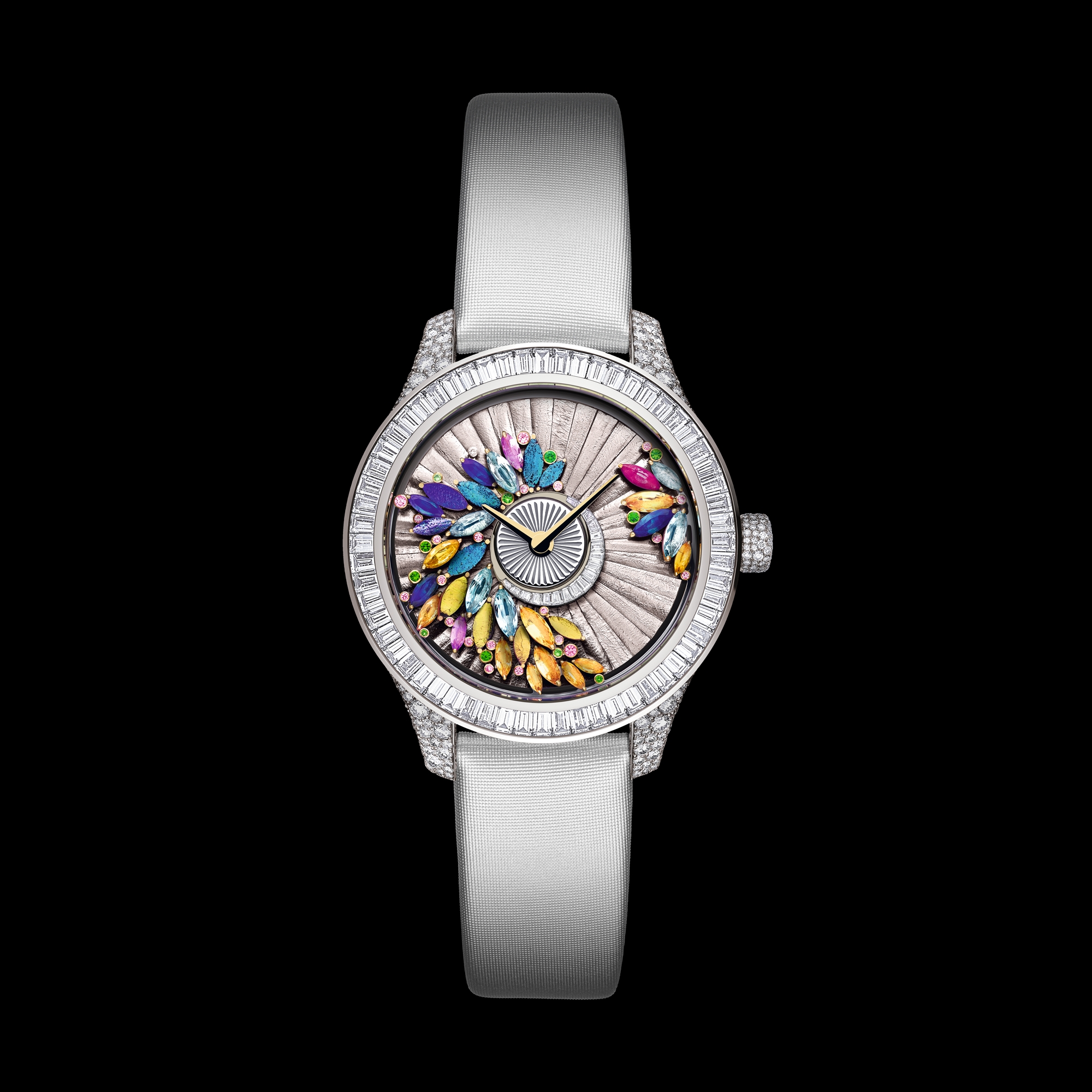 „Das Ballkleid muss das Kleid deiner Träume sein und gleichzeitig einen traumhaften Menschen aus dir machen“, sagte einst Christian Dior. Die Dior Grand Bal Kollektion erinnert daher an ein Ballkleid, das im Rhythmus des Uhrwerks Dior Inversé und der funktionellen Schwungmasse auf der Vorderseite des Zifferblatts mitschwingt. Wie die edlen Partykleider, die in den Couture-Ateliers von Dior aus Satin-, Faille- und Taftstoffen entworfen werden, sind auch die Modelle der Dior Grand Bal Kollektion mit Goldfäden, Netzgeweben, Seide, Federn, Schmucksteinen oder auch Skarabäusflügeln verziert. Technisch innovative Uhrmacherei im Dienste der Eleganz. Edle Materialien und ein Wirbelwind aus Farben erinnern an die zauberhaften Bälle, die Monsieur Dior so sehr liebte, und laden die Trägerin ein, über die Tanzfläche zu schweben.