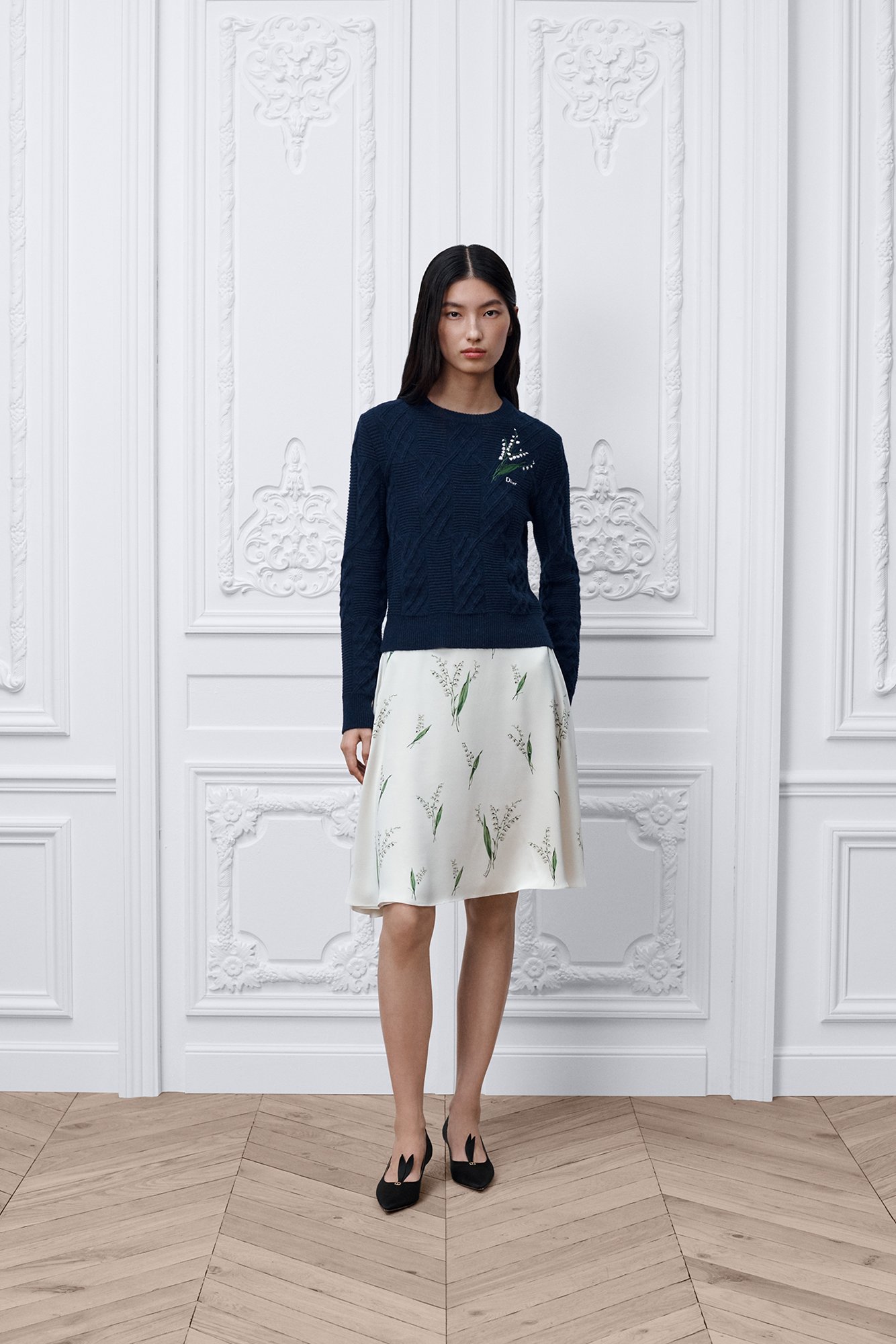 Seidencrêpe in Weiß mit Lily of the Valley Motiv in Grün