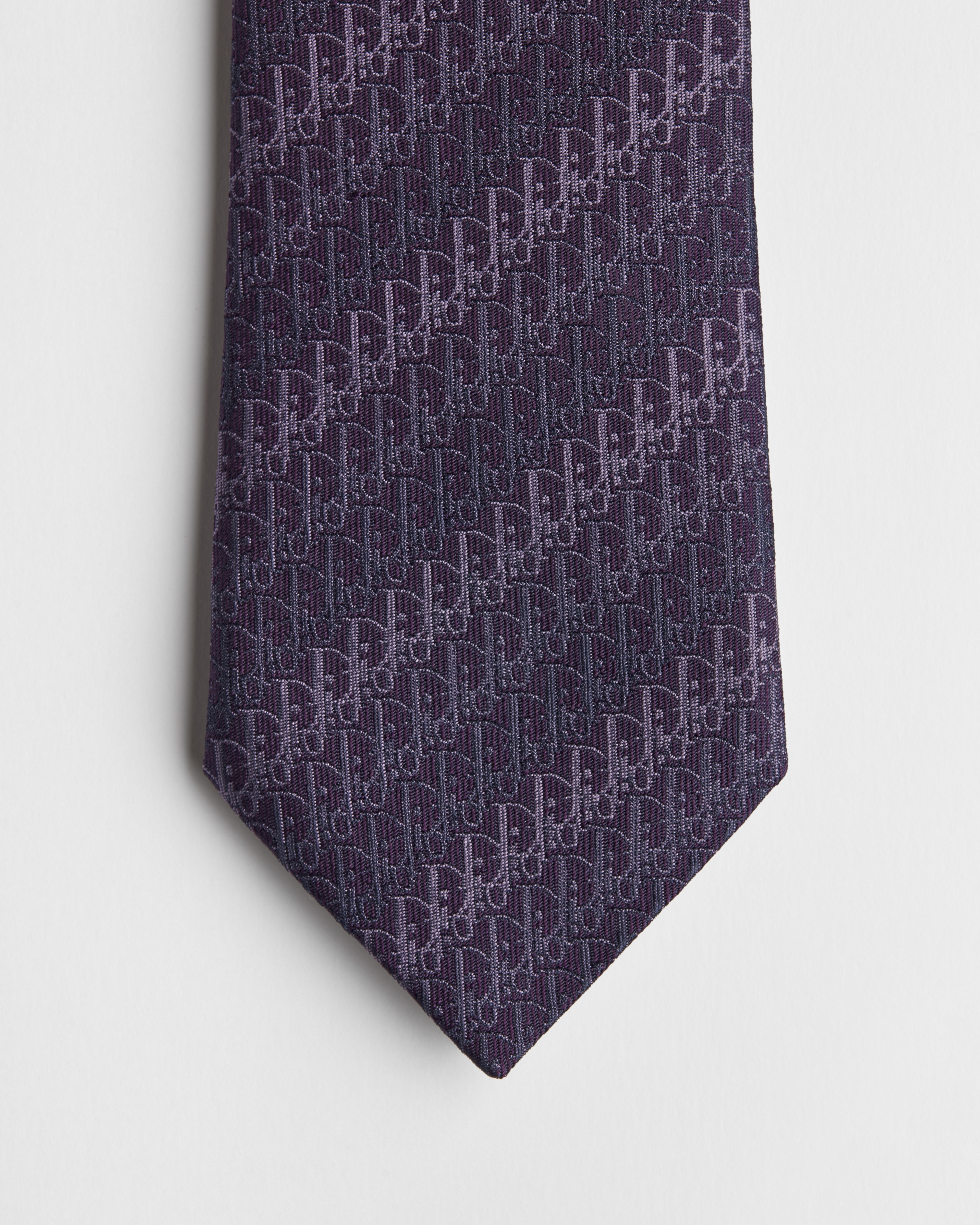 Die lila Krawatte zeigt das Dior Oblique Trio Motiv, eine Neuinterpretation des klassischen Musters mit einem dezenten, dreifarbigen Effekt. Das elegante Seidendesign verleiht jedem Anzug eine grafische Note.