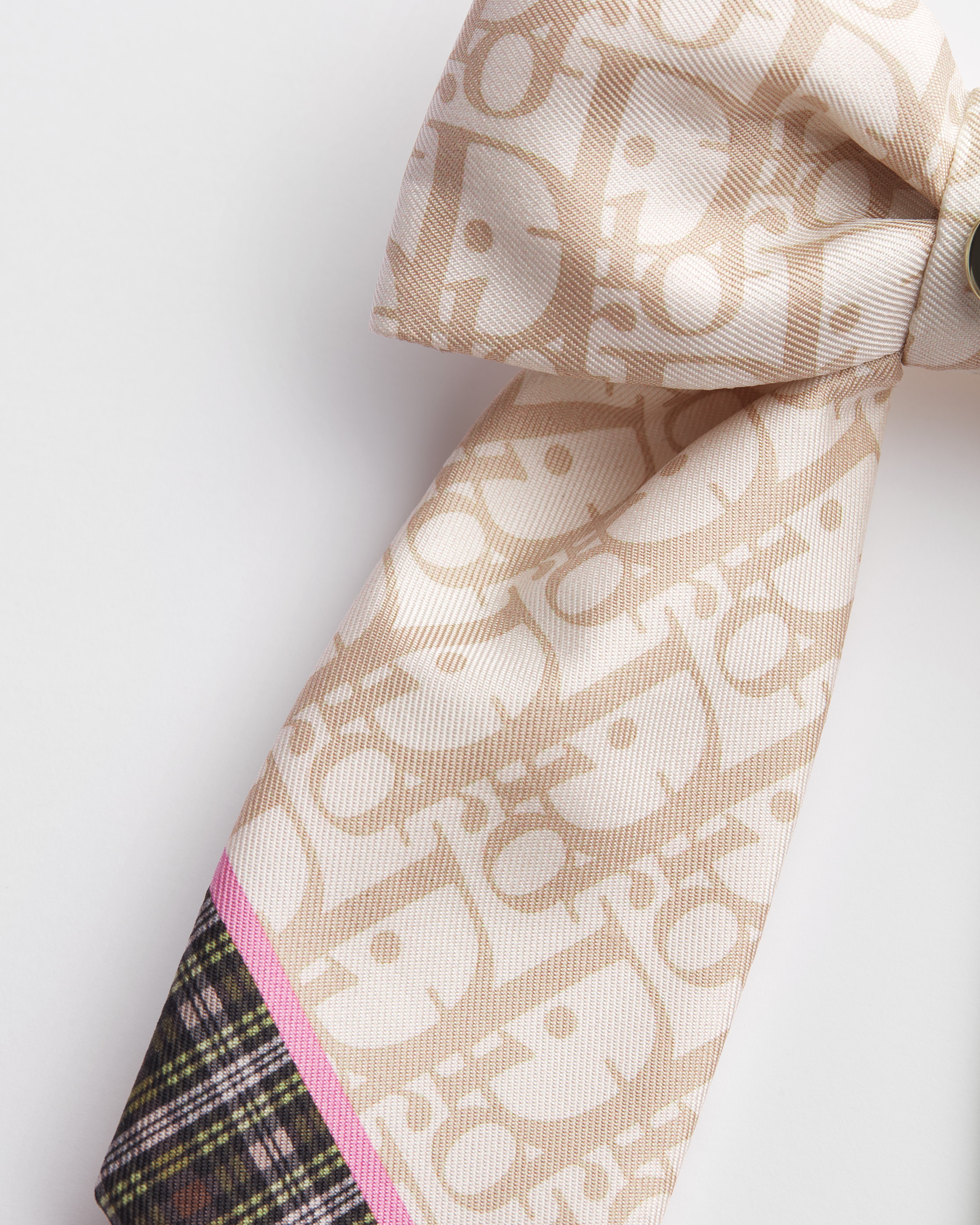 Die Dior Twist Schleife zeigt sich im eleganten Stil der Maison in einer großen Ausführung. Das Design aus Seidentwill ist ein Symbol der Maison und mit einem beigen Dior Infini Tartan Motiv verziert. Dabei wird das unverkennbare Dior Oblique Motiv dekonstruiert und mit einem Tartanmuster kombiniert, was die britische Schneidertradition erneut in den Fokus rückt. Die Haarspange wird durch den Dior Schriftzug in hellem Gold-Finish in der Mitte zusätzlich akzentuiert und verleiht jeder Frisur eine moderne Note.