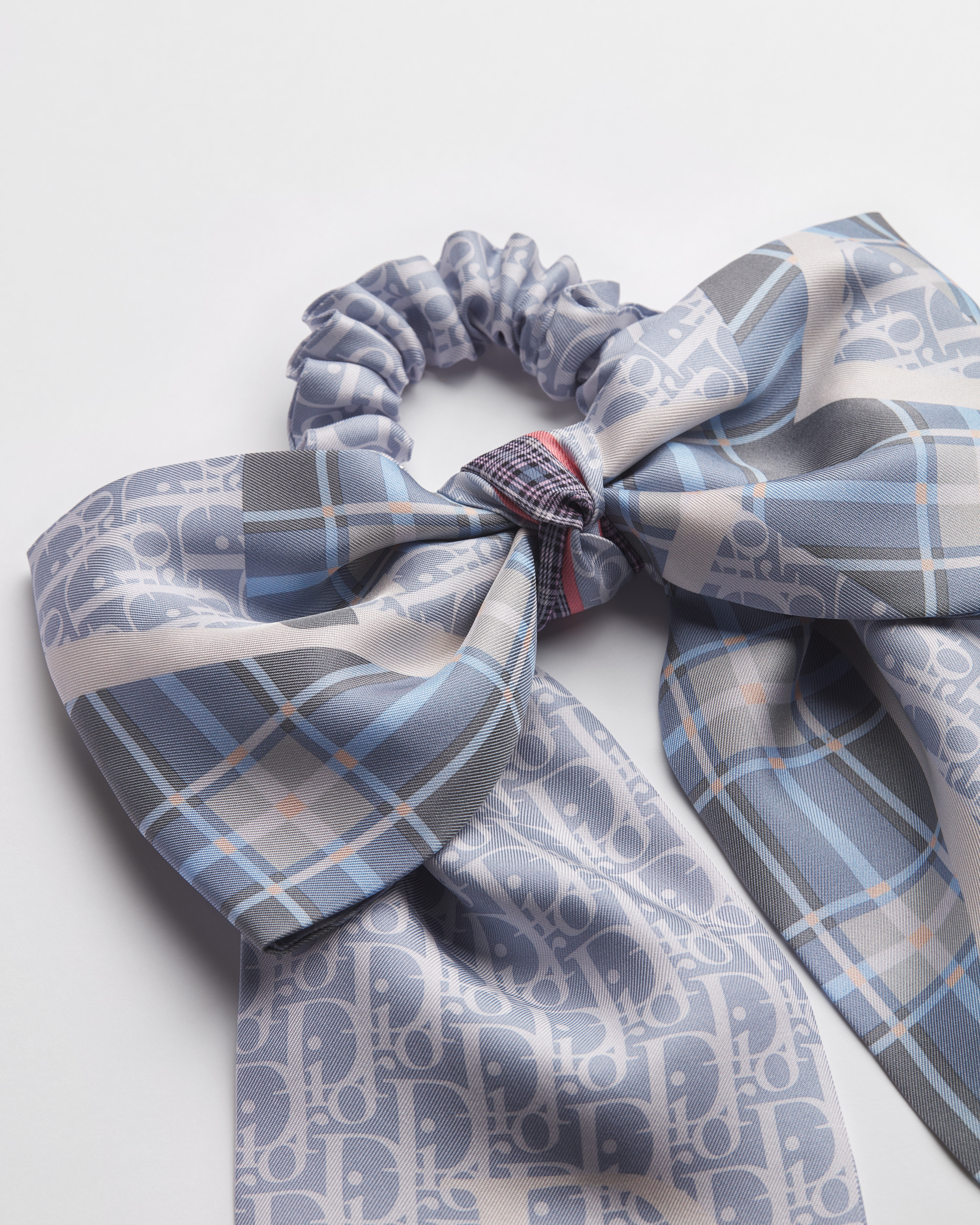Das Diorette Haarband ist mit einem Dior Infini Tartan Motiv in Bleu Ciel verziert. Dabei wird das unverkennbare Dior Oblique Motiv dekonstruiert und mit einem Tartanmuster kombiniert, was die britische Schneidertradition erneut in den Fokus rückt. Eine große Schleife aus Seidentwill erinnert an ein wichtiges Symbol der Maison. Das Accessoire verleiht jeder Frisur eine moderne Note.