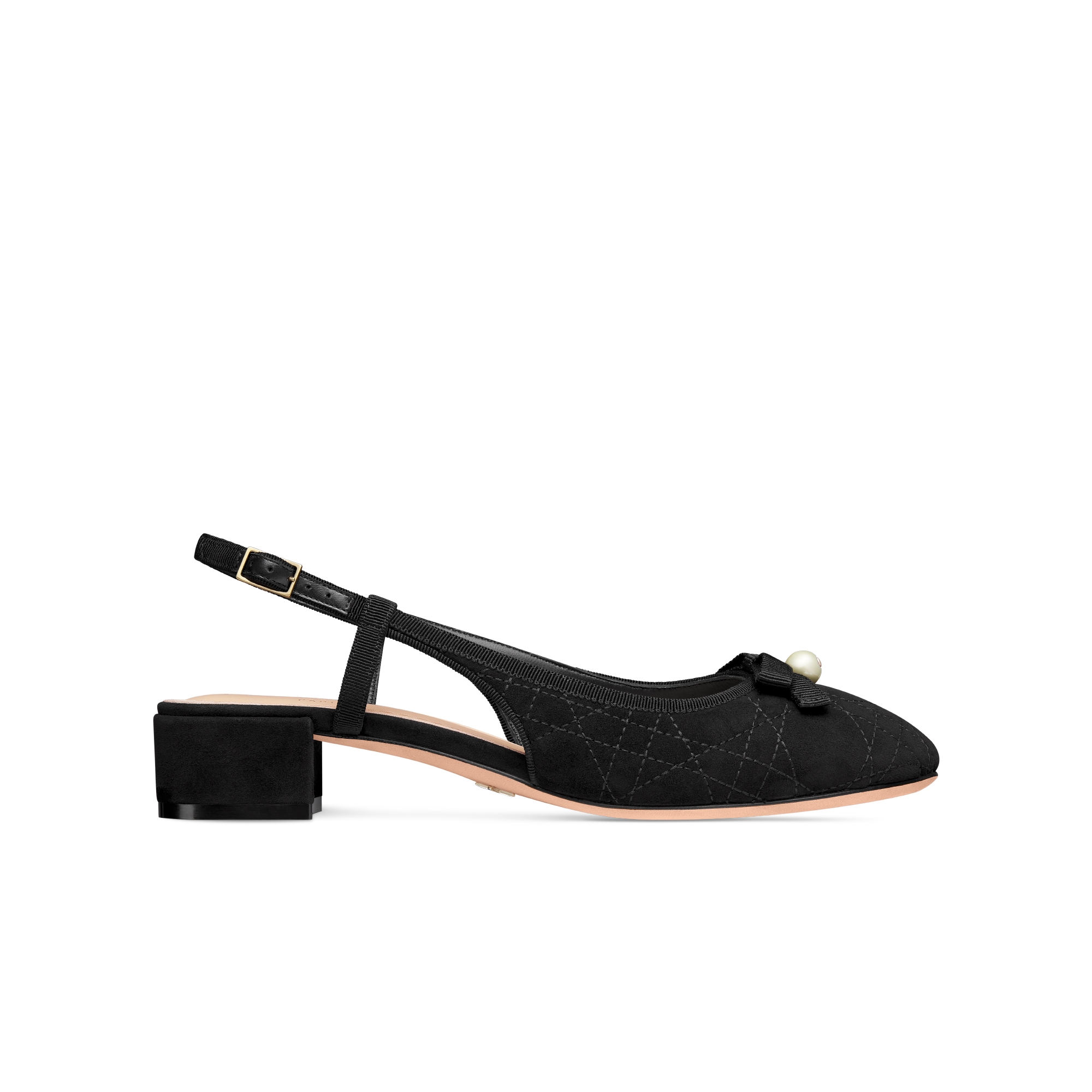 The Dior Ballet slingback pump is a refined creation. Constructed in black quilted Cannage suede goatskin, it is adorned with a delicate grosgrain bow on the front embellished with a white CD resin pearl, inspired by the iconic Dior Tribales earrings. Completed by an adjustable slingback and 3-cm (1-inch) block heel, the pump will lend the finishing touch to an elegant look.