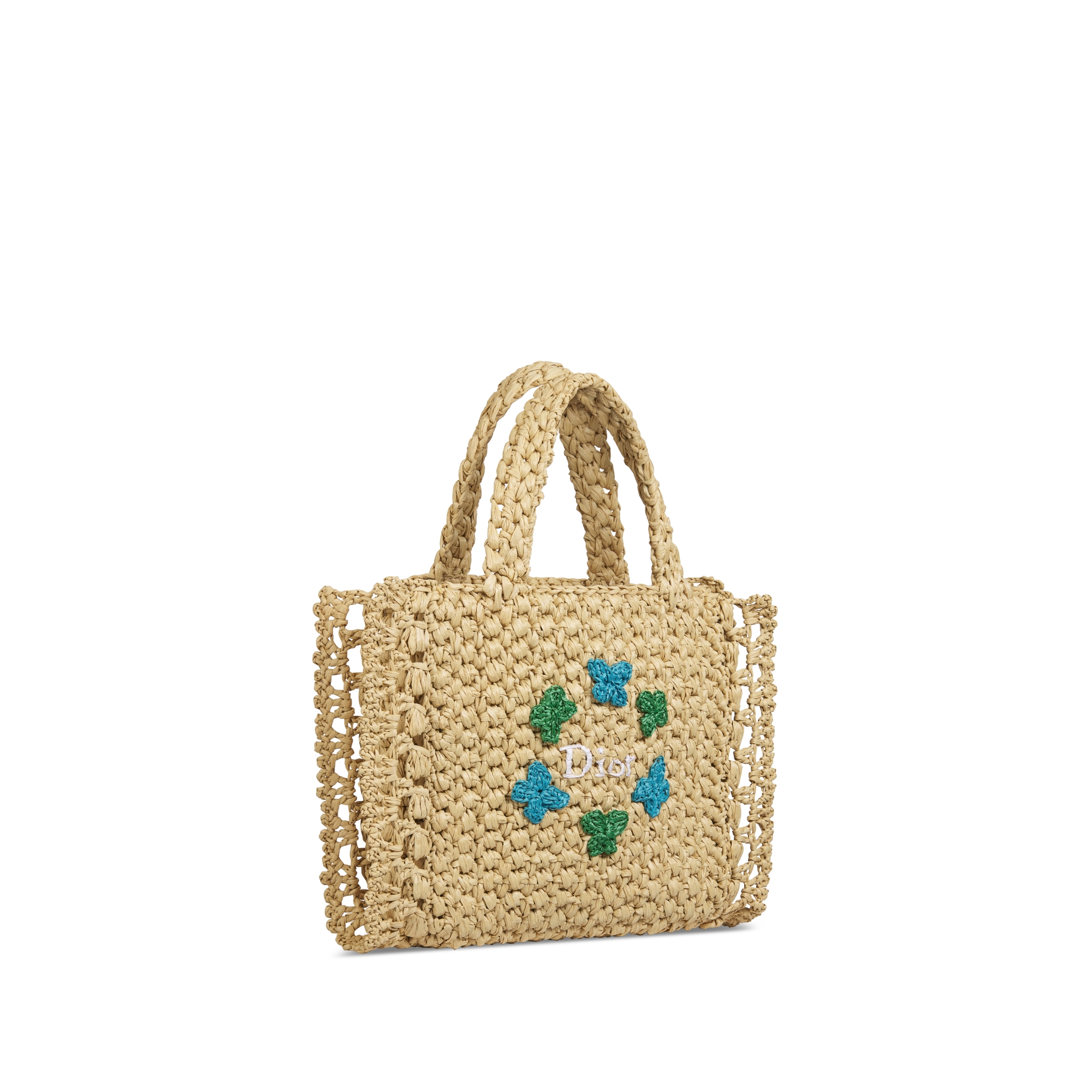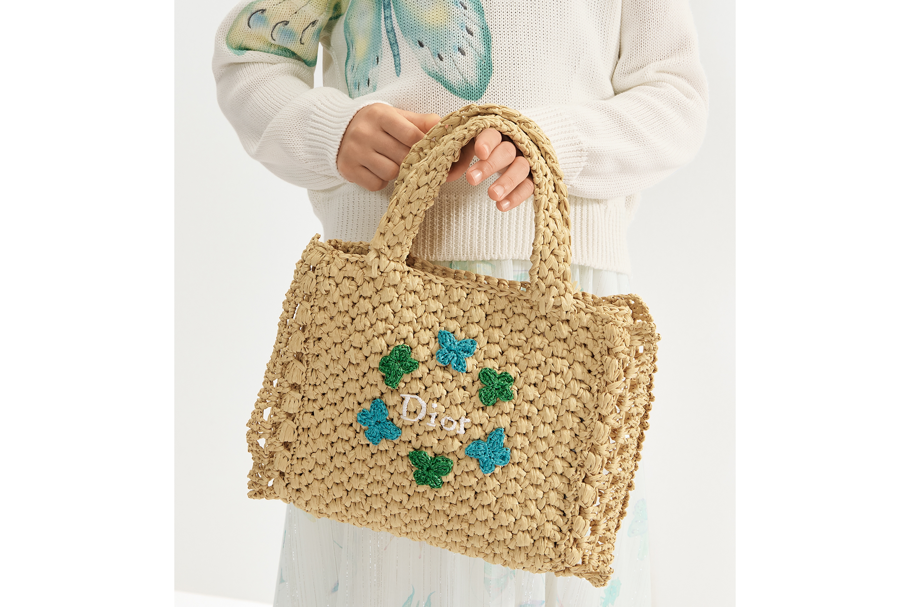 Embroidered ivory Dior and green and lavender blue butterflies on the front