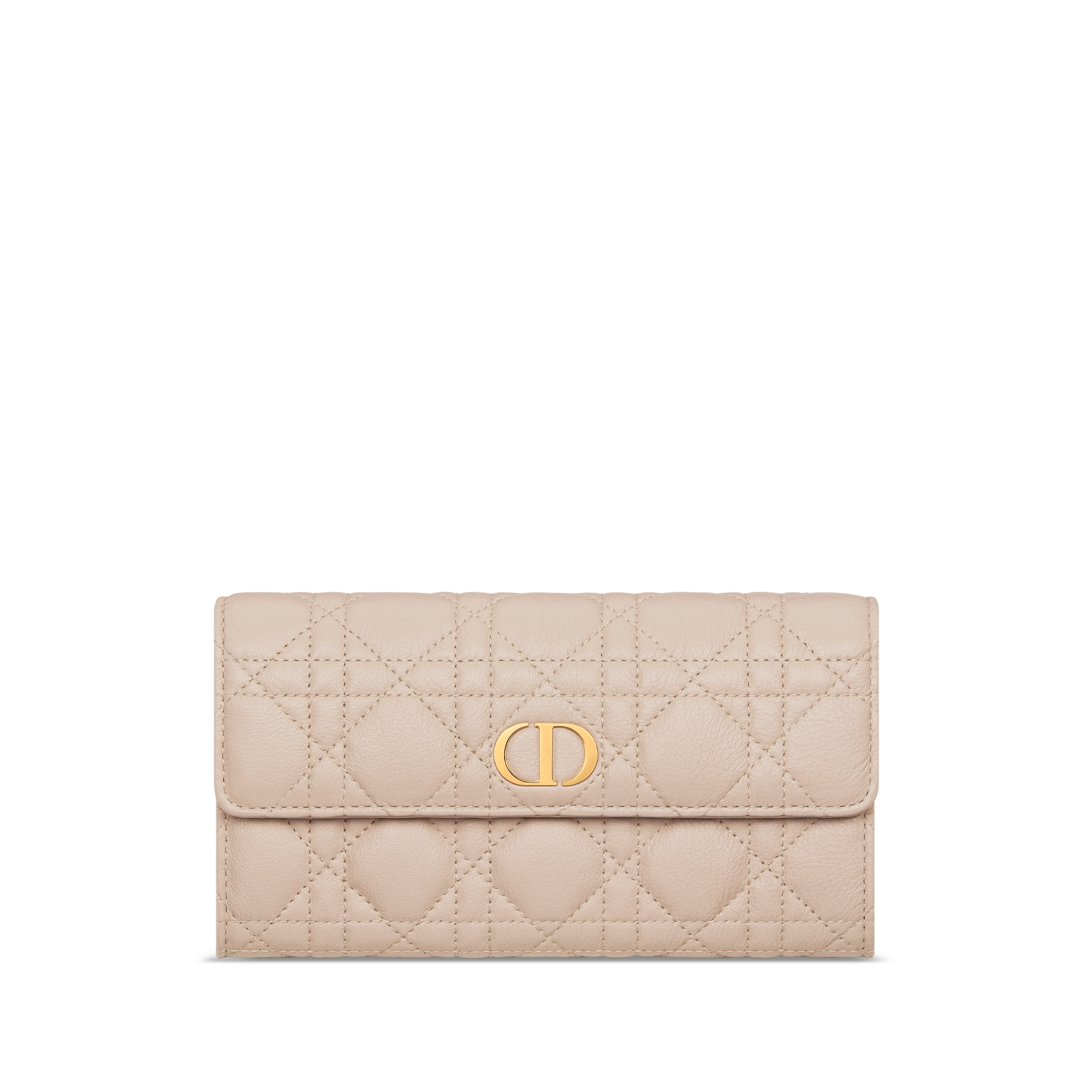 The Dior Caro Orchid long wallet features hallmark Cannage topstitching in a contemporary design. Crafted in powder beige calfskin, it is adorned with a CD signature flap on the front. The chic and spacious wallet can be coordinated with other bags from the same line.