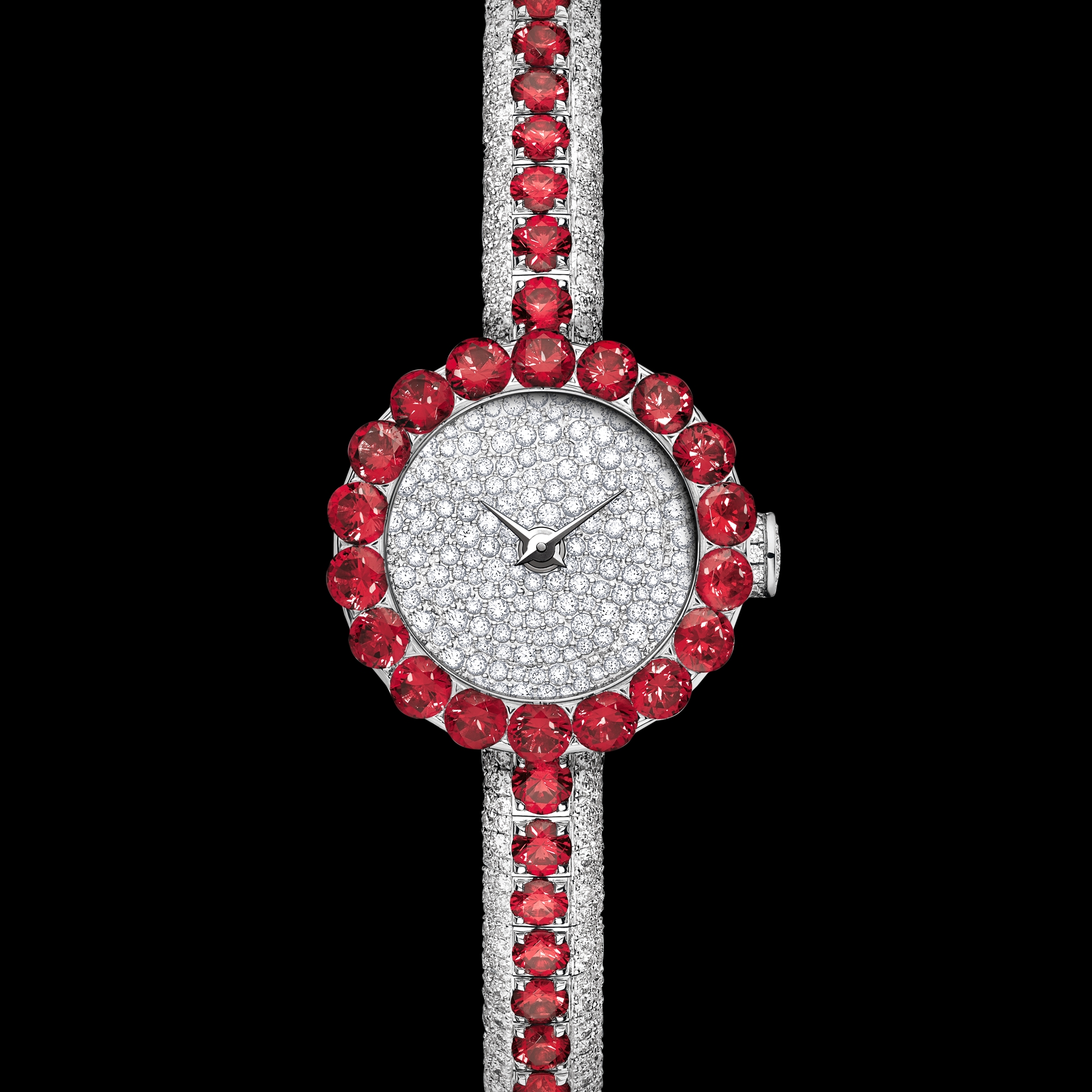 21 mm white gold case, bezel set with rubies and diamonds, crown set with diamonds.