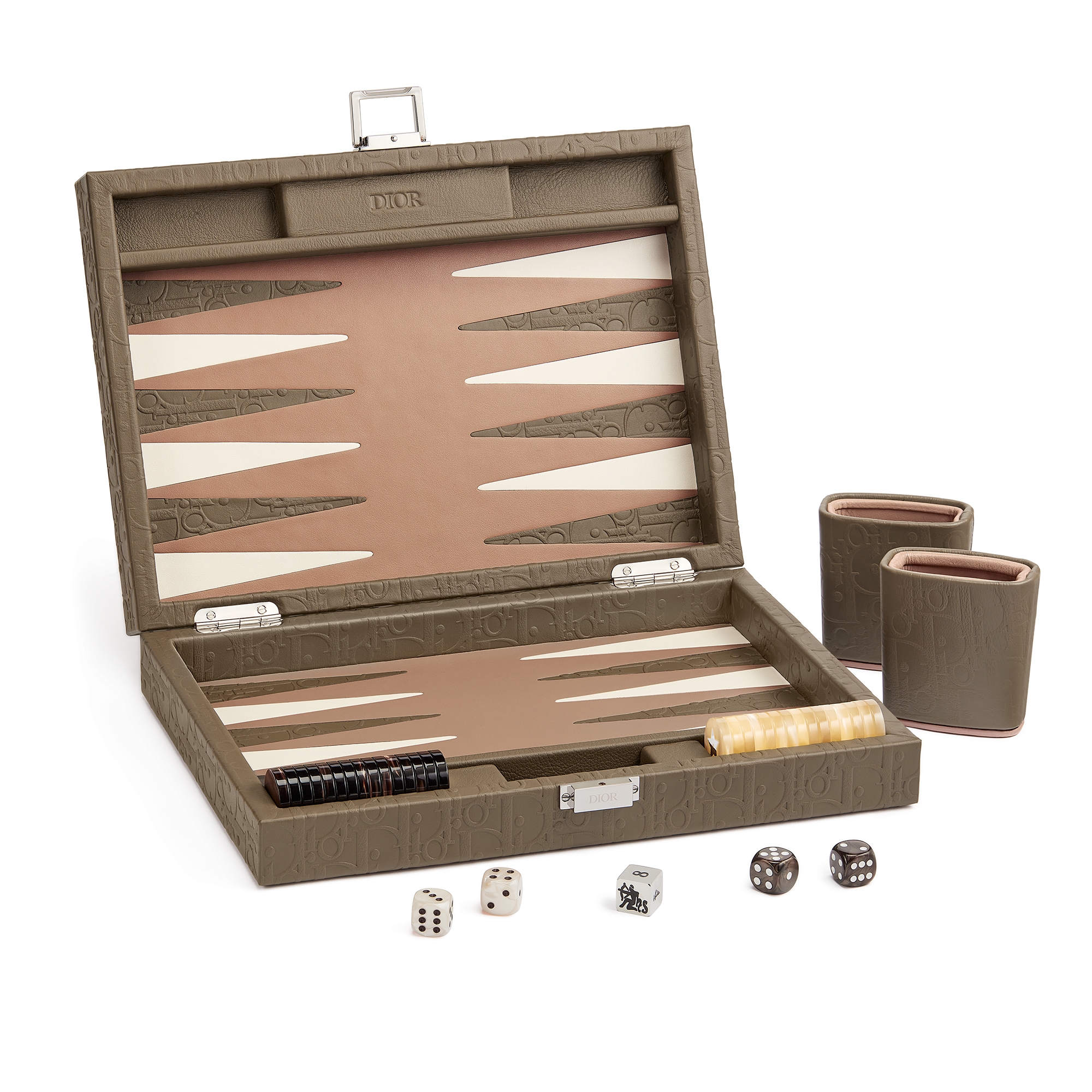 An homage to the game that endlessly inspired the life and collections of the founder, the Dior Maison backgammon set is revisited with two exclusive new styles in beguiling shades of blue and bronze. A small version in embossed leather, the set showcases the Dior Oblique motif. Equipped with two sets of 15 pieces engraved with a gold-tone star honoring Mr. Dior's lucky charm, two pairs of dice, a doubling cube and two dice cups, these objects of desire and leisure promise unforgettable moments of sharing with loved ones.