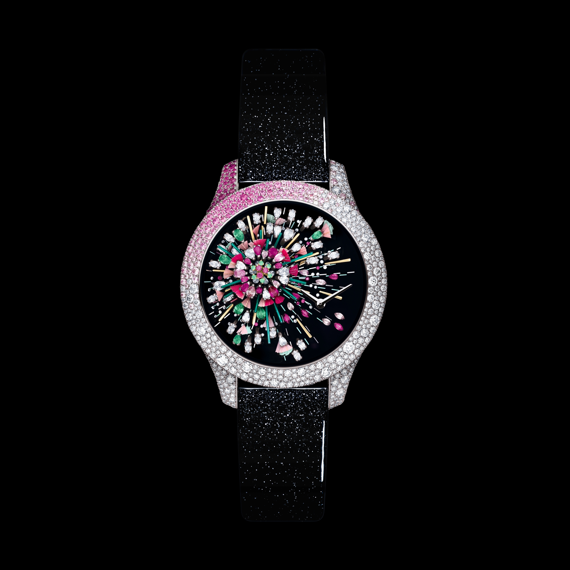 Shiny black lacquer with one pink heart, set with round, pear-cut and marquise-cut diamonds, pear-cut and marquise-cut pink sapphires, round and pear-cut emeralds and round rubies, and adorned with white gold and polished lacquered pink gold elements and feathers, white gold faceted hour and minute hands