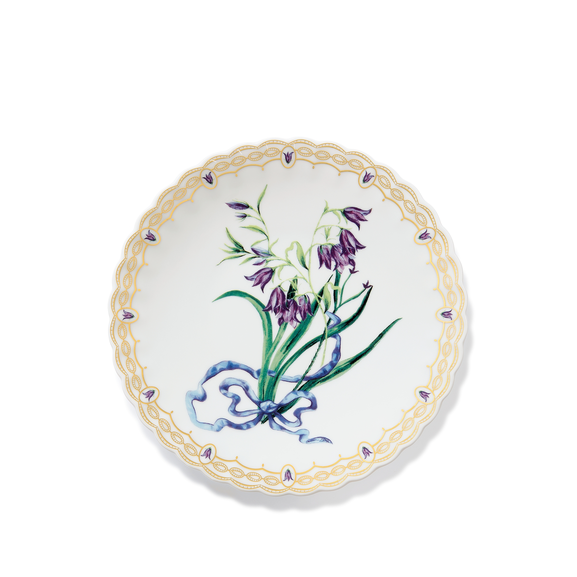 The dessert plate is part of Cordelia de Castellane's Flower Couture collection, designed as a poetic herbarium with a quintessentially Dior aesthetic. Crafted in porcelain elevated by subtle multicolor tones, the plate is adorned with a delicate bellflower entwined with an ethereal ribbon, and features scalloped edges decorated with 24-carat gold detailing. The dish will enhance tables with a couture touch and can be coordinated with other pieces in the Flower Couture collection for a Dior herbarium arrangement.