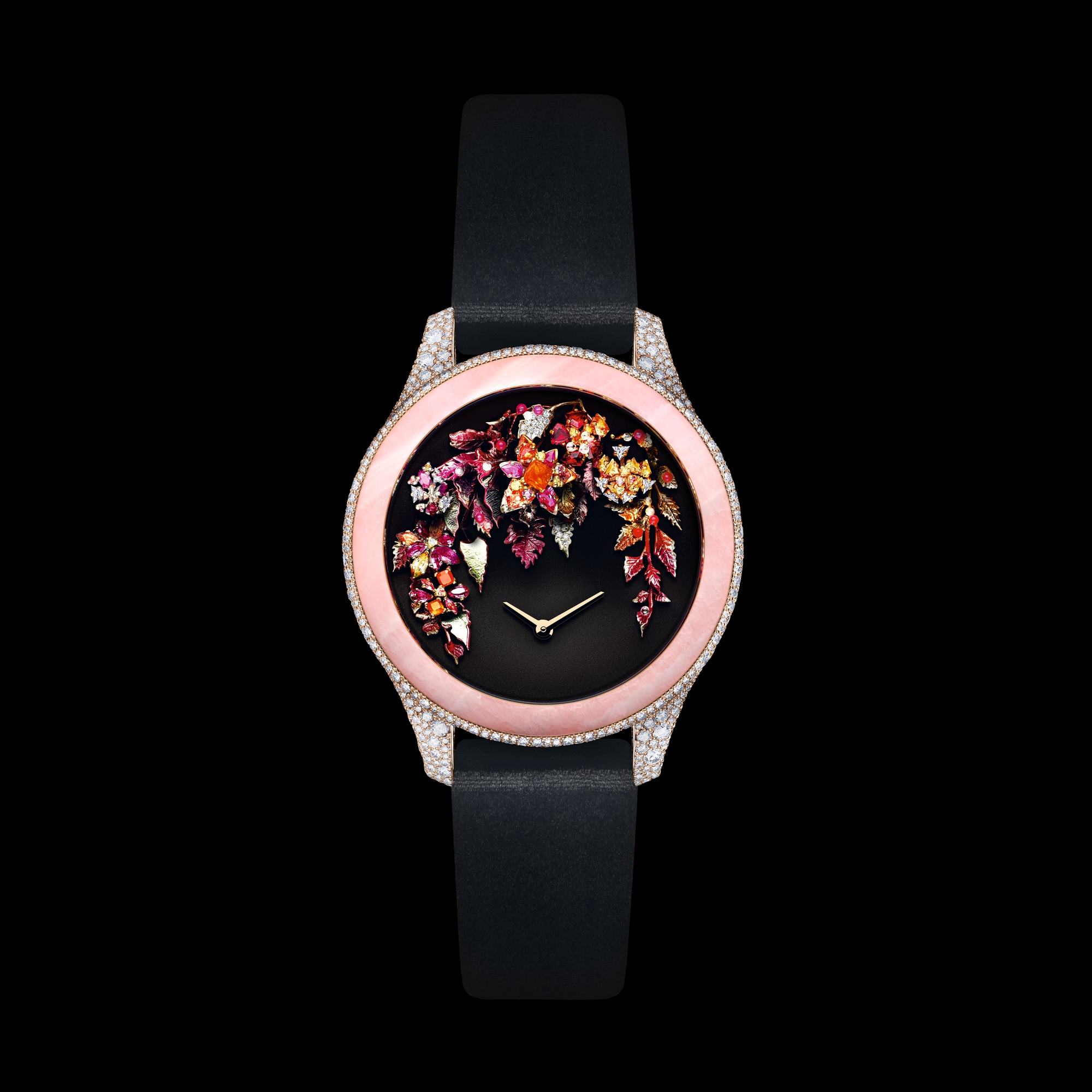 Black dial adorned with gold leaves and flowers set with brilliant-cut and triangle-cut diamonds, brilliant-cut and marquise-cut pink sapphires, brilliant-cut and trillion-cut yellow sapphires, marquise-cut red spinels, pear-cut and marquise-cut rubies, trillion-cut Malaya garnets and spessartite,