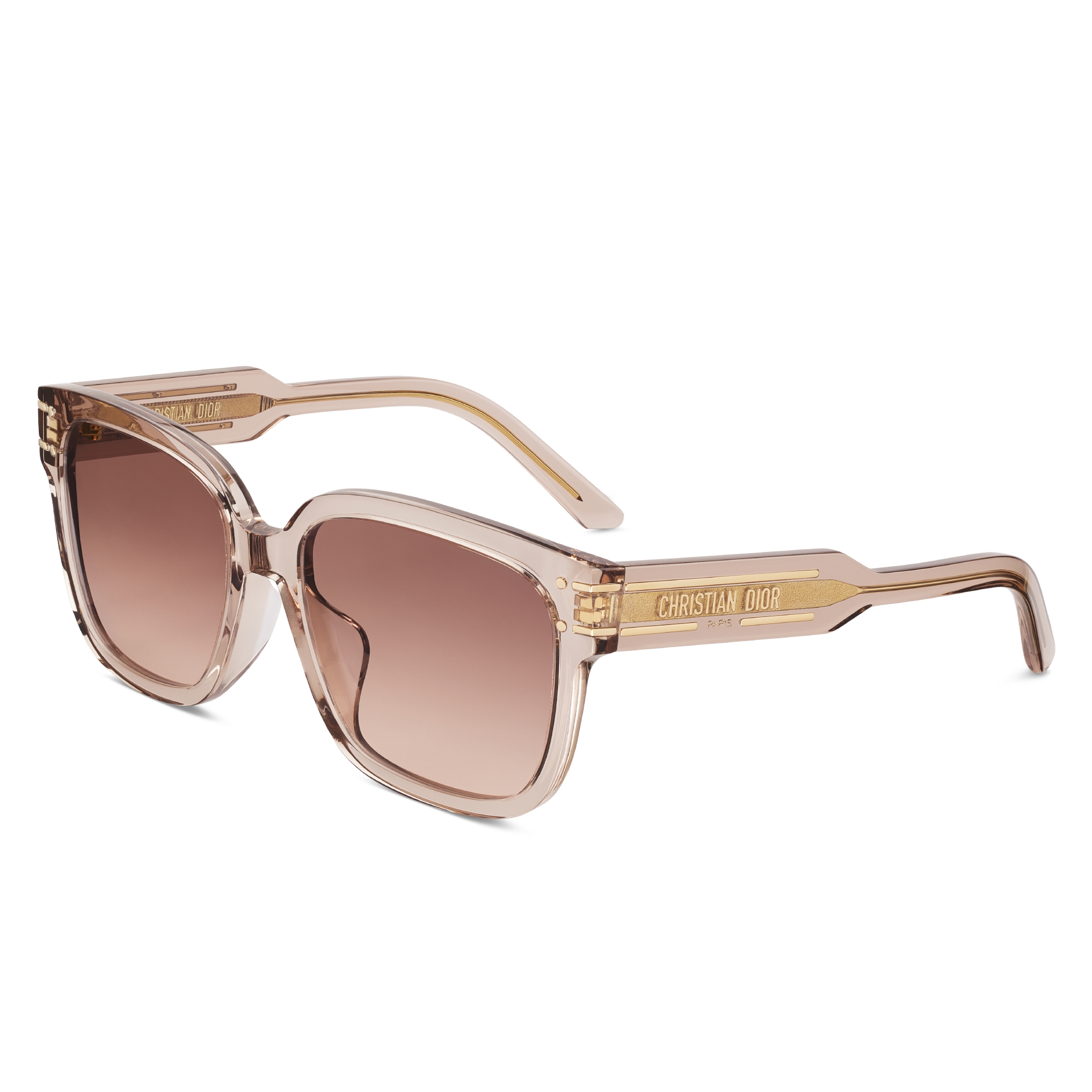 The DiorSignature S7F sunglasses enhance the now iconic House line. The couture design is distinguished by a contemporary and casual square shape. The transparent sand beige acetate frame showcases the Christian Dior Paris signature embellished with gold-finish metal lines that extend onto the front. Completed by gradient brown-to-pink lenses, the modern sunglasses will lend a decisively Dior style to any look.