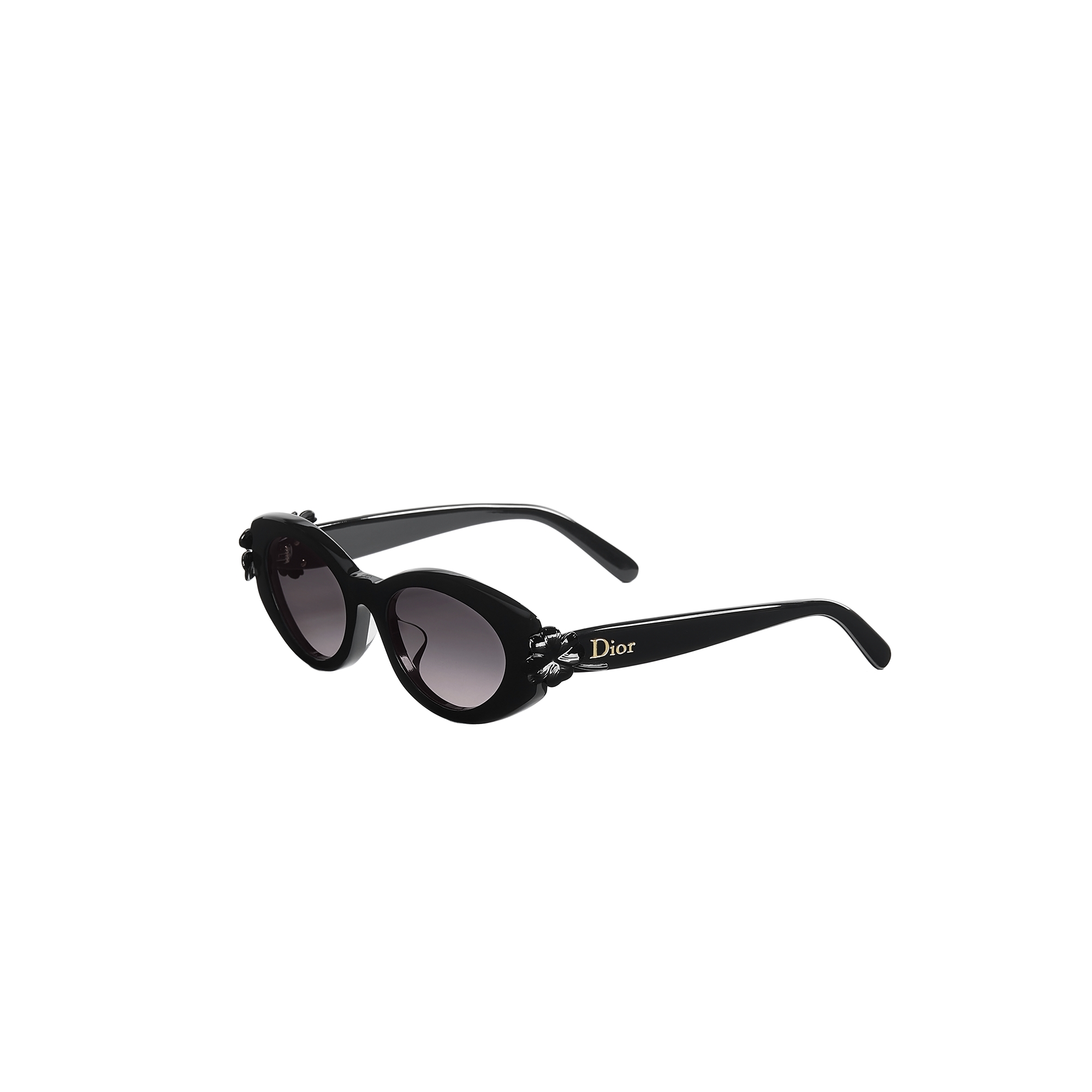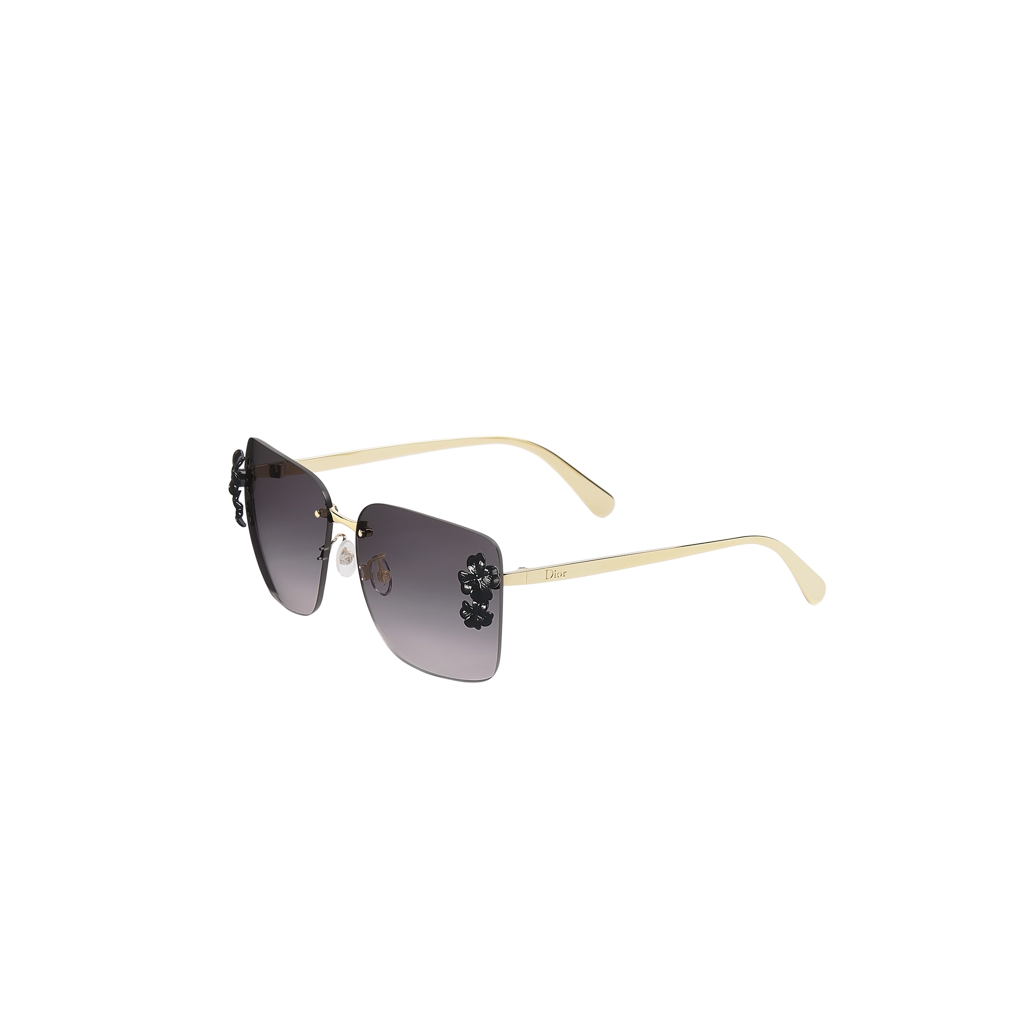 Thin gold-finish metal temples with clover and ladybug details and Dior signature