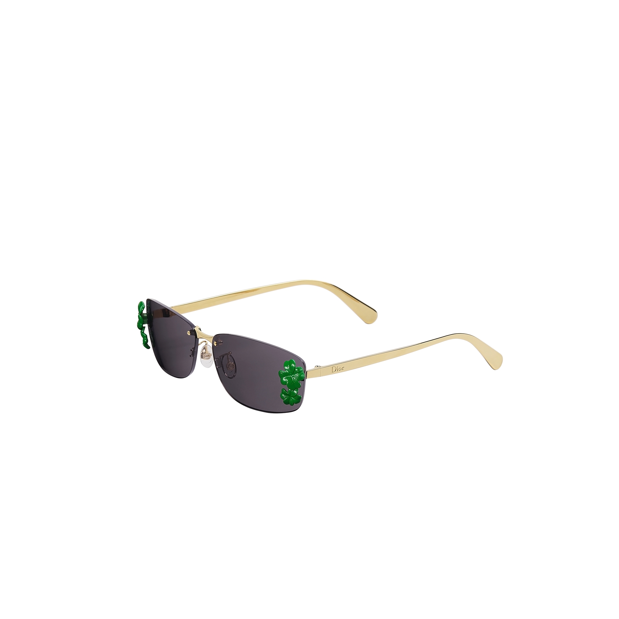 Imagined by Jonathan Anderson for the House, the Dior Clover S1U sunglasses capture the essence of modern aesthetics by breathing new life into one of the House's iconic lucky symbols. The frameless rectangular shape is highlighted by temples engraved with the Dior signature, clovers and a delicate ladybug on the right. Complemented by gray lenses adorned with green lacquer clovers, the statement sunglasses will bring a couture touch to any look.