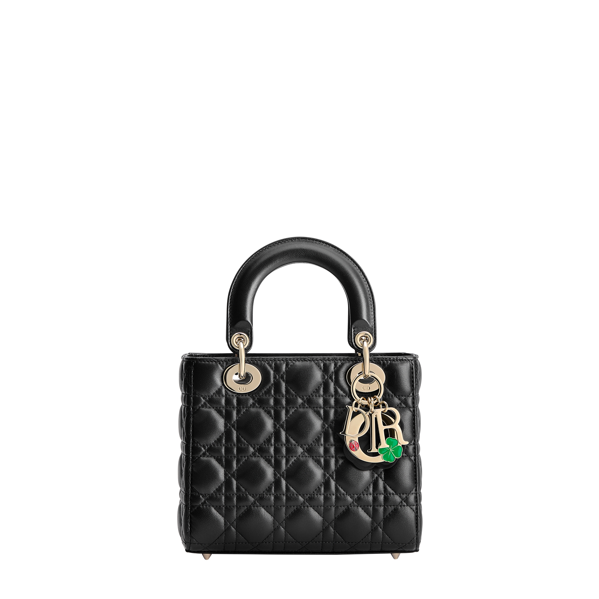 Front D.I.O.R. charms with lacquer clover and ladybug details and leather Dior Clover charm