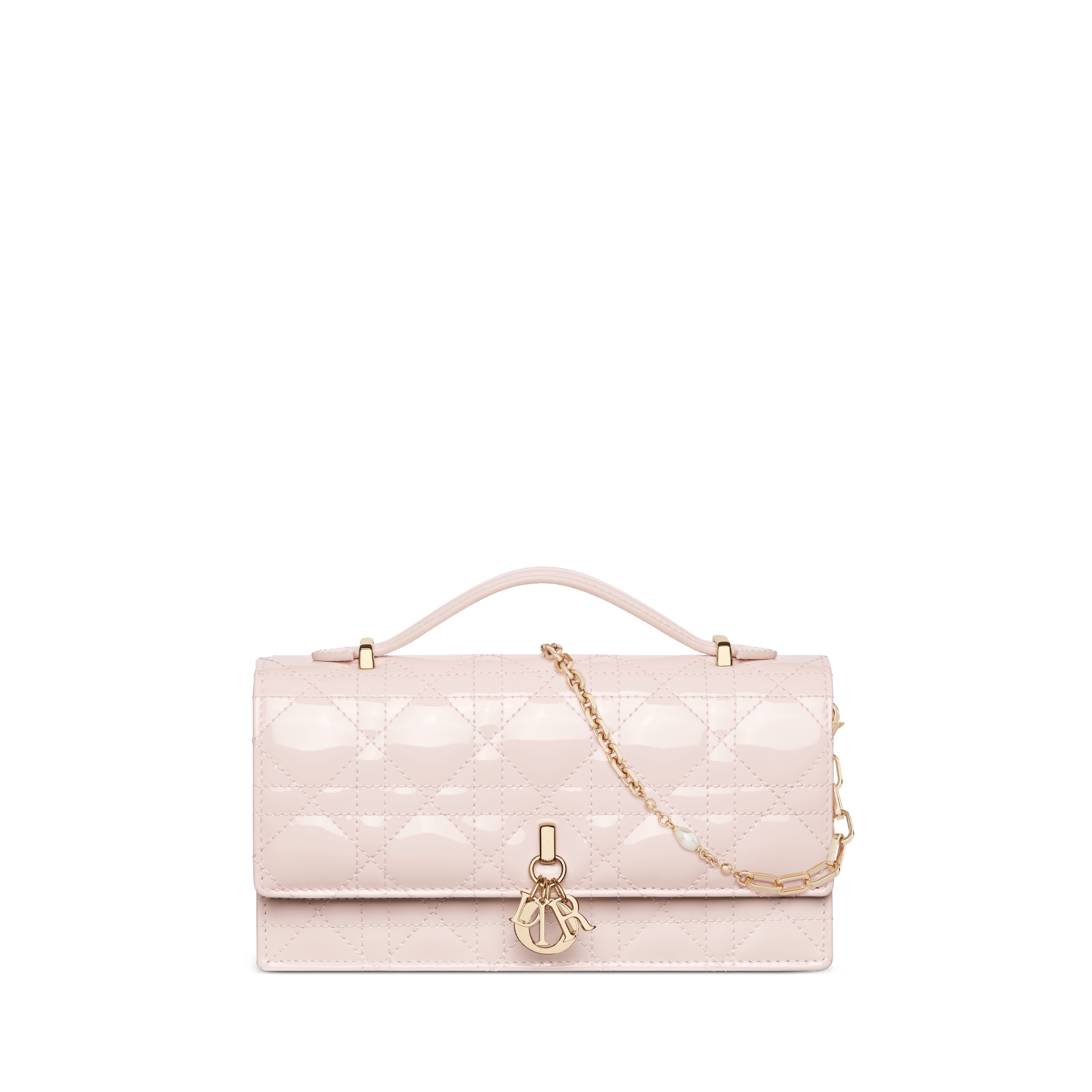 The My Dior mini bag elevates the line with an elegant and functional design. Crafted in powder pink patent calfskin with Cannage stitching, it features a flap enhanced by D.I.O.R. charms on the front. Equipped with compartments and card slots, the functional accessory will hold all the essentials and is the ideal day and evening companion. A top handle completed by a removable chain punctuated with resin pearls allows the bag to be carried by hand or worn crossbody.