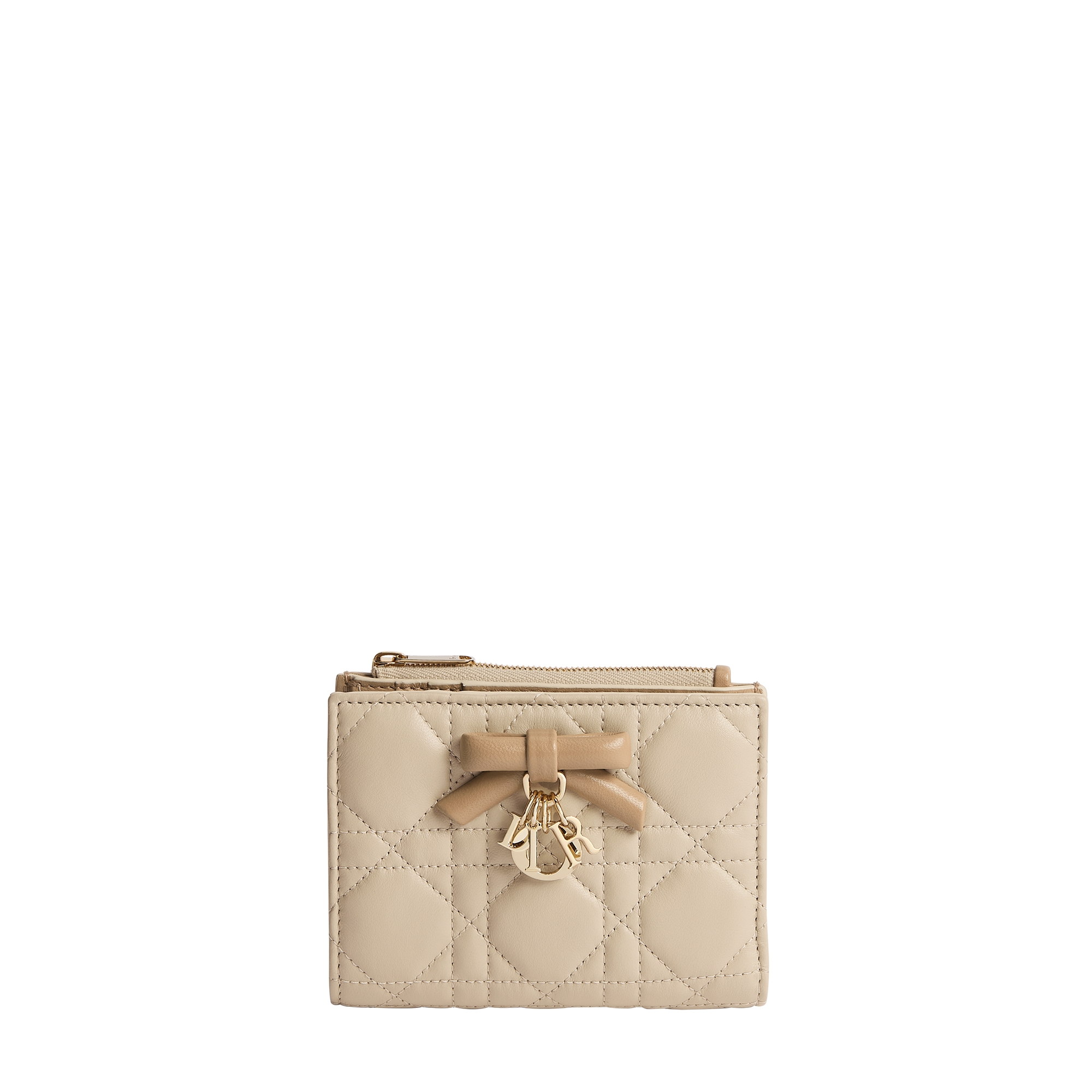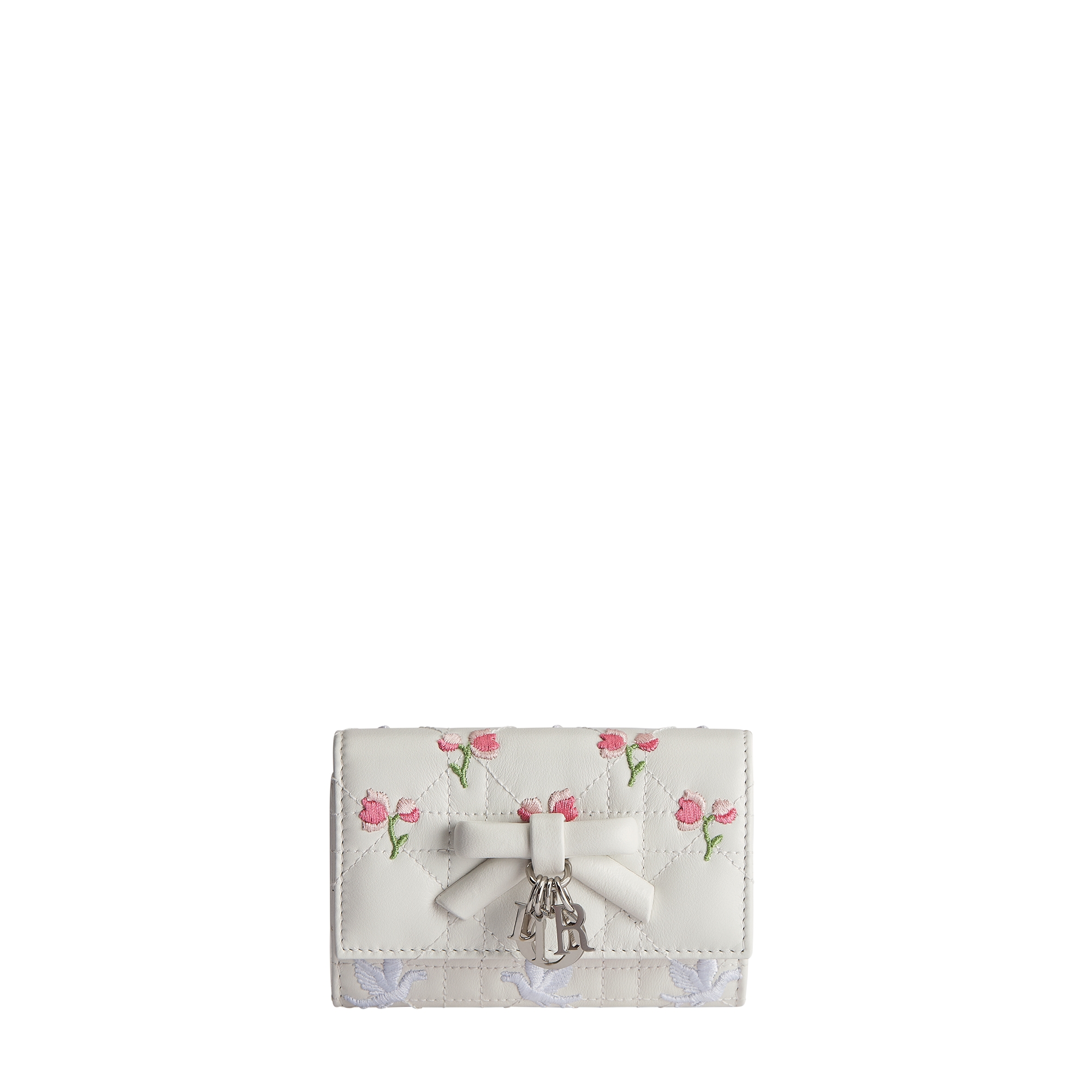 The My Dior Glycine wallet is distinguished by a compact and practical design. The white Cannage lambskin is embroidered with the Dioramour capsule's multicolor Doves & Roses motif, drawing inspiration from House archives for Jonathan Anderson's celebration of love around the world. A decorative leather bow embellished with silver-finish metal D.I.O.R. charms adorns the front. Accommodating all the essentials, the refined accessory will fit anywhere and can be paired with other Dioramour creations.