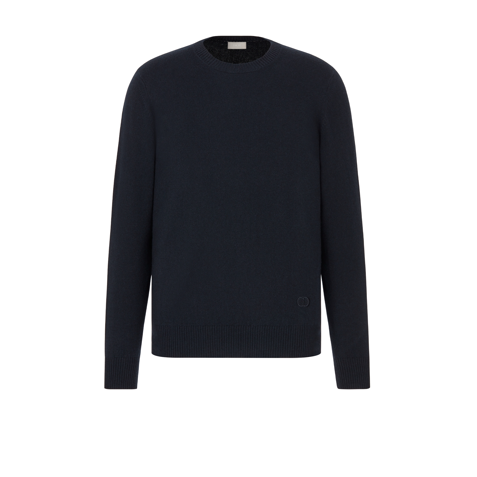 The sweater is crafted in navy blue cashmere fine jersey. Enhanced by a tonal 'CD Icon' embroidery, the silhouette features a crew neck and ribbed cuffs and hem. The timeless sweater may be worn with any pair of jeans for an elegant and relaxed look.