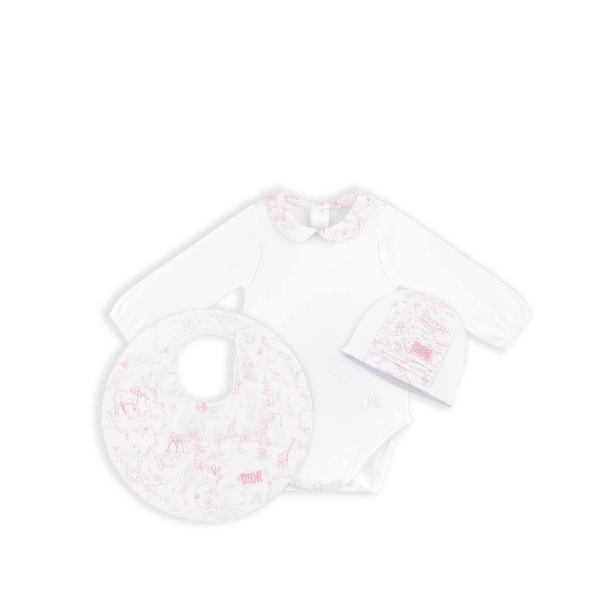 The newborn gift set honors the House's hallmark Toile de Jouy motif. Crafted in white cotton interlock, it consists of a long-sleeved bodysuit, a beanie and a bib enhanced by cotton satin panels with a pale pink print. Fitted with snaps along the back and inseam for easy dressing, the bodysuit is completed by a Peter Pan collar. Accented by Dior embroideries, the set will create an ideal gift for newborns.