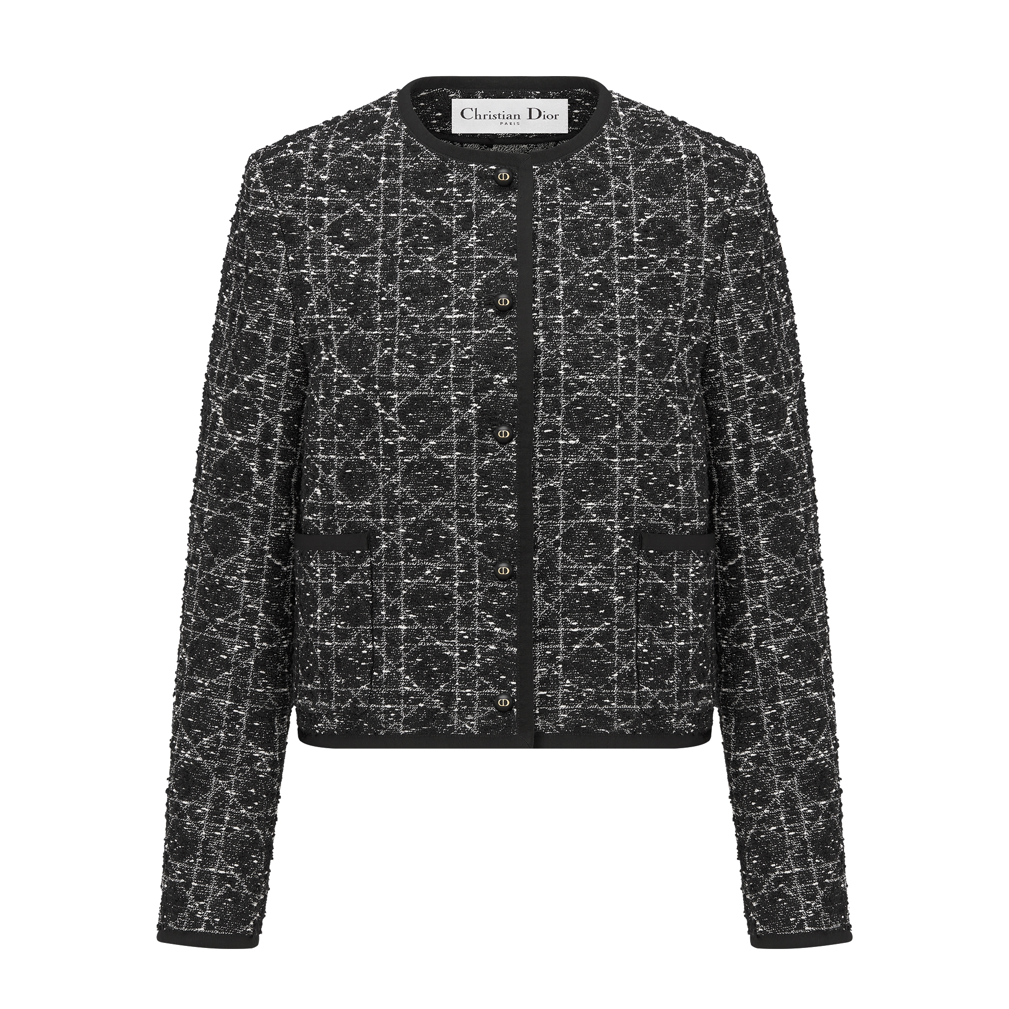 The jacket honors the signature Macrocannage motif. Crafted in black and white technical cotton tweed with a textured effect, it has a relaxed, cropped silhouette and front patch pockets. It is distinguished by grosgrain detailing and a button closure with black resin pearls decorated with the CD signature, inspired by the House's hallmark earring. The jacket will pair perfectly with a skirt from the season for a couture look.