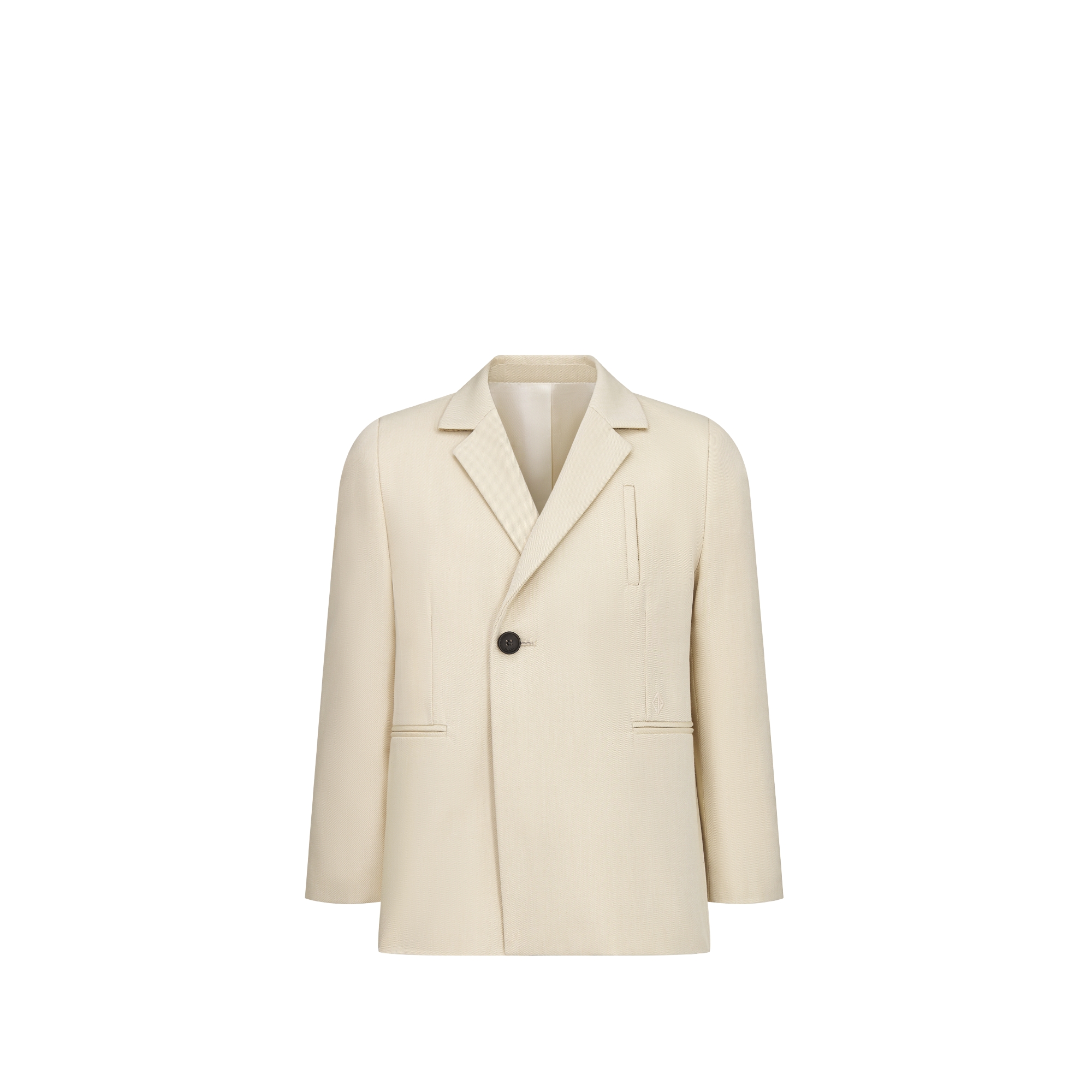 The suit jacket reimagines a staple piece from the Dior Men wardrobe in a version for boys. Crafted in ecru cotton, it showcases a classic silhouette enhanced by a tonal CD Diamond embroidery. Embellished with a notched lapel collar and three piped pockets, it has a black button closure. The jacket can be styled effortlessly with the matching pants or Bermuda shorts from the collection to complete a refined look.