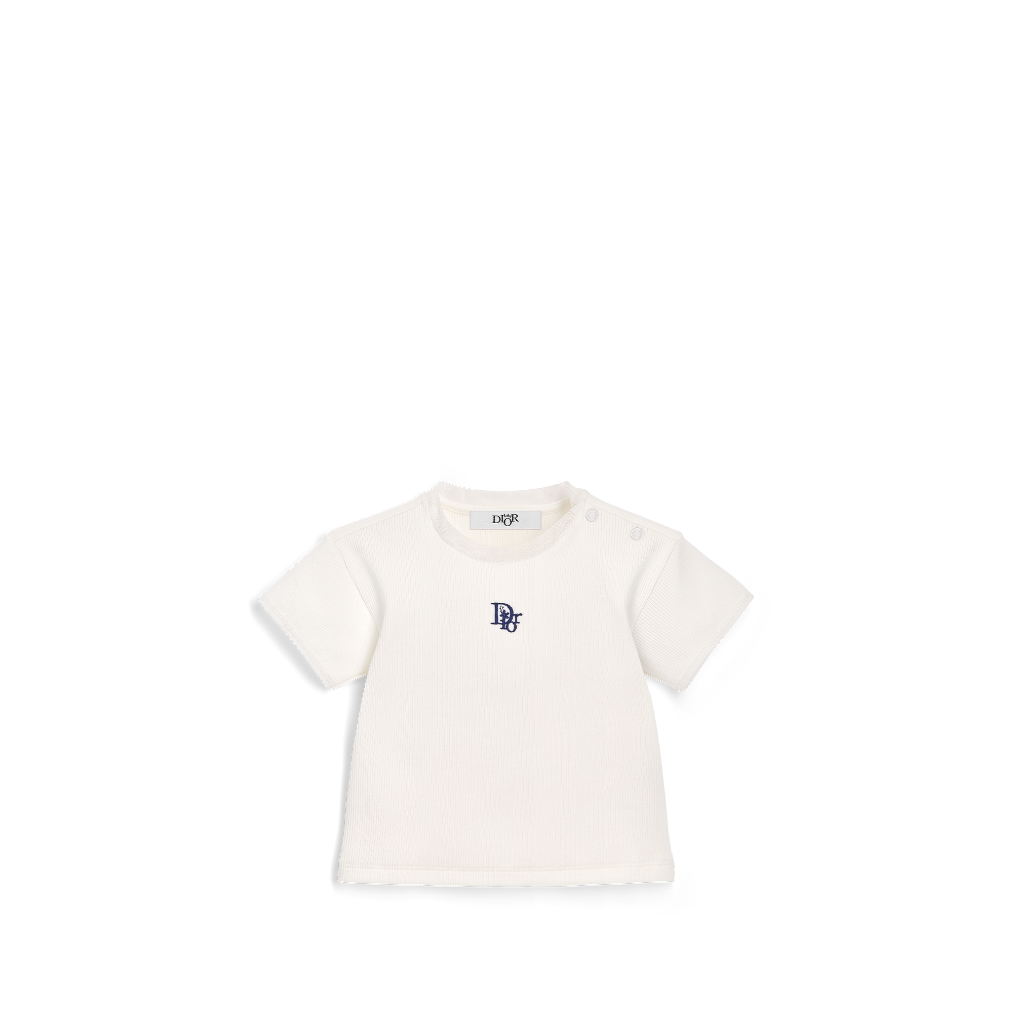 The classic T-shirt is revisited this season with a refined touch. Crafted in ivory ribbed cotton jersey, it is embellished with the indigo blue reimagined Dior Oblique embroidery on the front. Tonal tulle trim on the neckline and sleeve hems adds a chic touch. The T-shirt can be paired with a skirt from the collection to create a fresh look for summer evenings.
