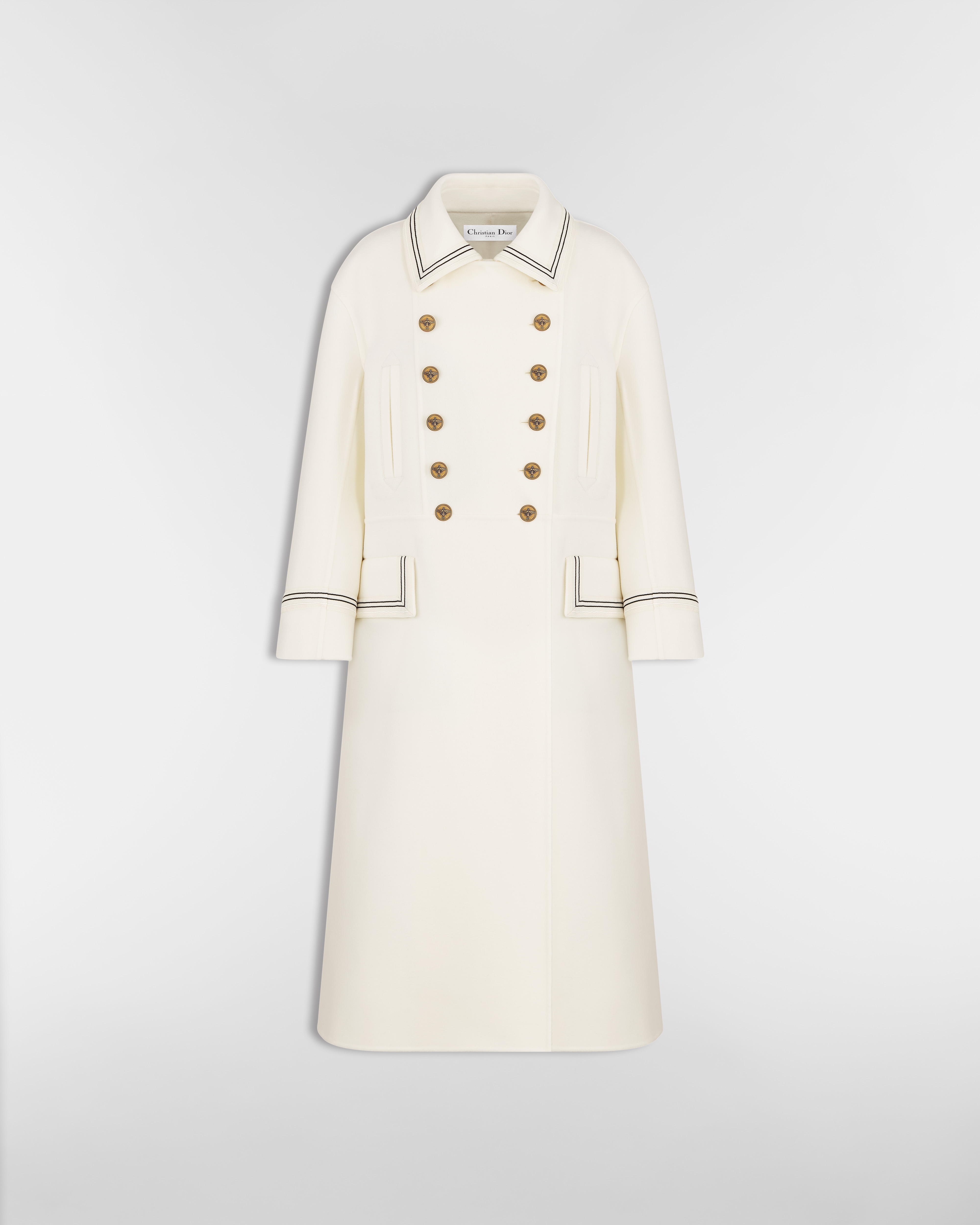The double-breasted coat redefines House codes of elegance. Crafted in ecru double-sided virgin wool-angora-blend felt, it features a regular-fit silhouette elevated by contrasting black passementerie on the collar, flap pockets and cuffs. The button closure showcases gold-finish metal buttons adorned with a bee and the CD signature. The sophisticated coat will enhance any attire with a touch of refinement.