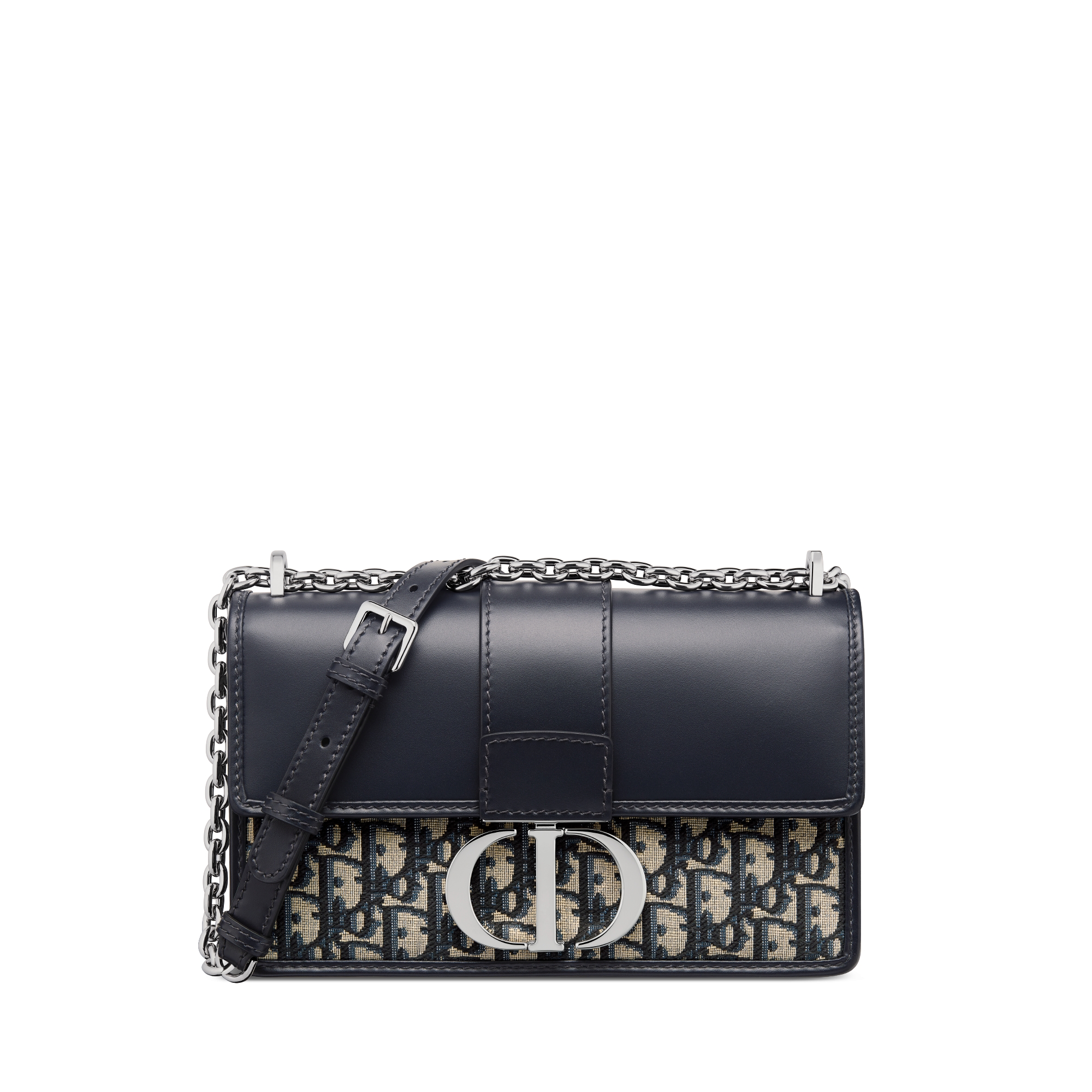 The 30 Montaigne line is inspired by the House's emblematic address and offers essential pieces that embody its iconic codes. The blue Dior Oblique jacquard style showcases a tonal smooth calfskin flap embellished with a palladium-finish metal CD clasp, inspired by the seal of a Christian Dior perfume bottle. Refined details such as an embossed 30 Montaigne signature on the back define the sleek design. Thanks to its chain, the bag can be carried by hand, worn over the shoulder or crossbody.