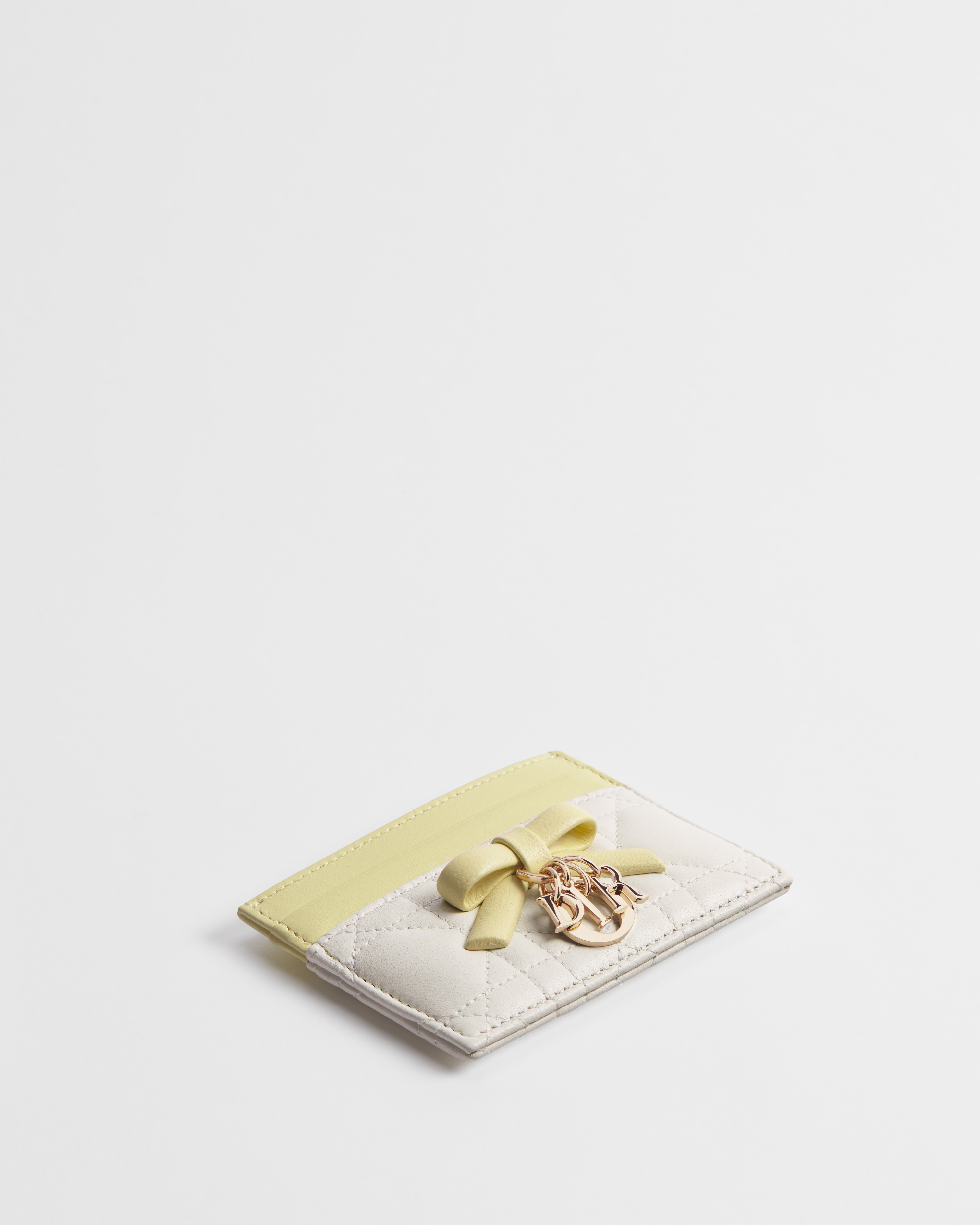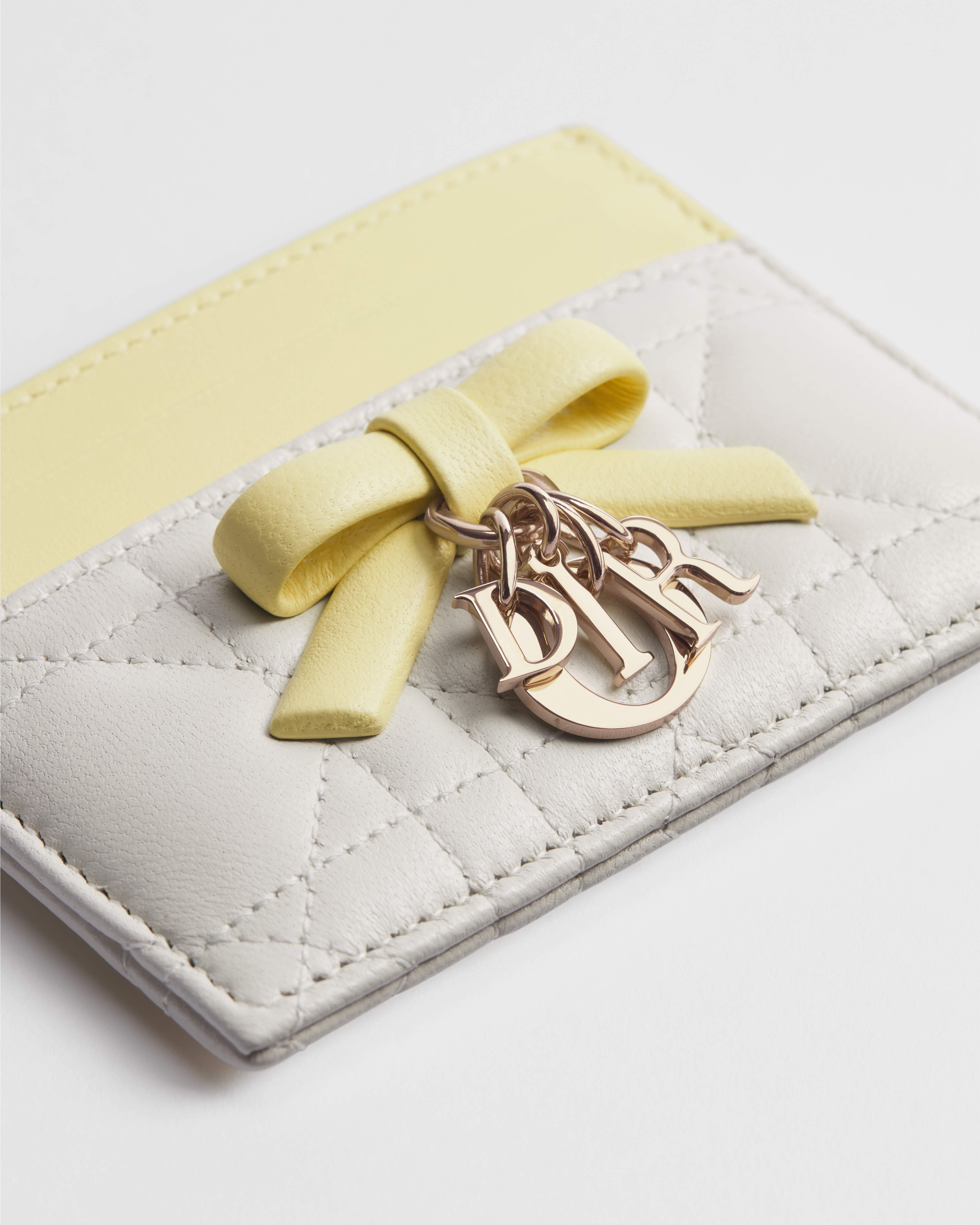 The Lady Dior Freesia card holder is an elegant and practical accessory. Crafted in latte and Trench beige lambskin with Cannage stitching, the style is enhanced by a decorative leather bow adorned with pale gold-finish metal D.I.O.R. charms on the front. Featuring five card slots, the refined accessory will fit anywhere and can be coordinated with other creations from the Lady Dior line.