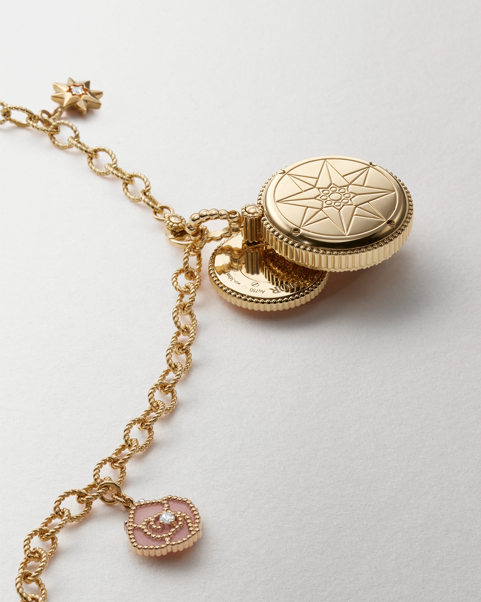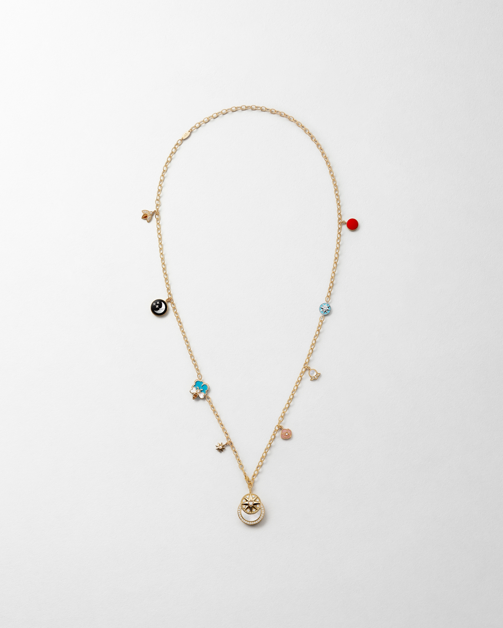 18K yellow gold cable chain decorated with eight lucky charms in yellow, pink and white gold adorned with mother-of-pearl, tiger's eye, pink opal, turquoise and set with 34 brilliant-cut diamonds (0.54 ct*)