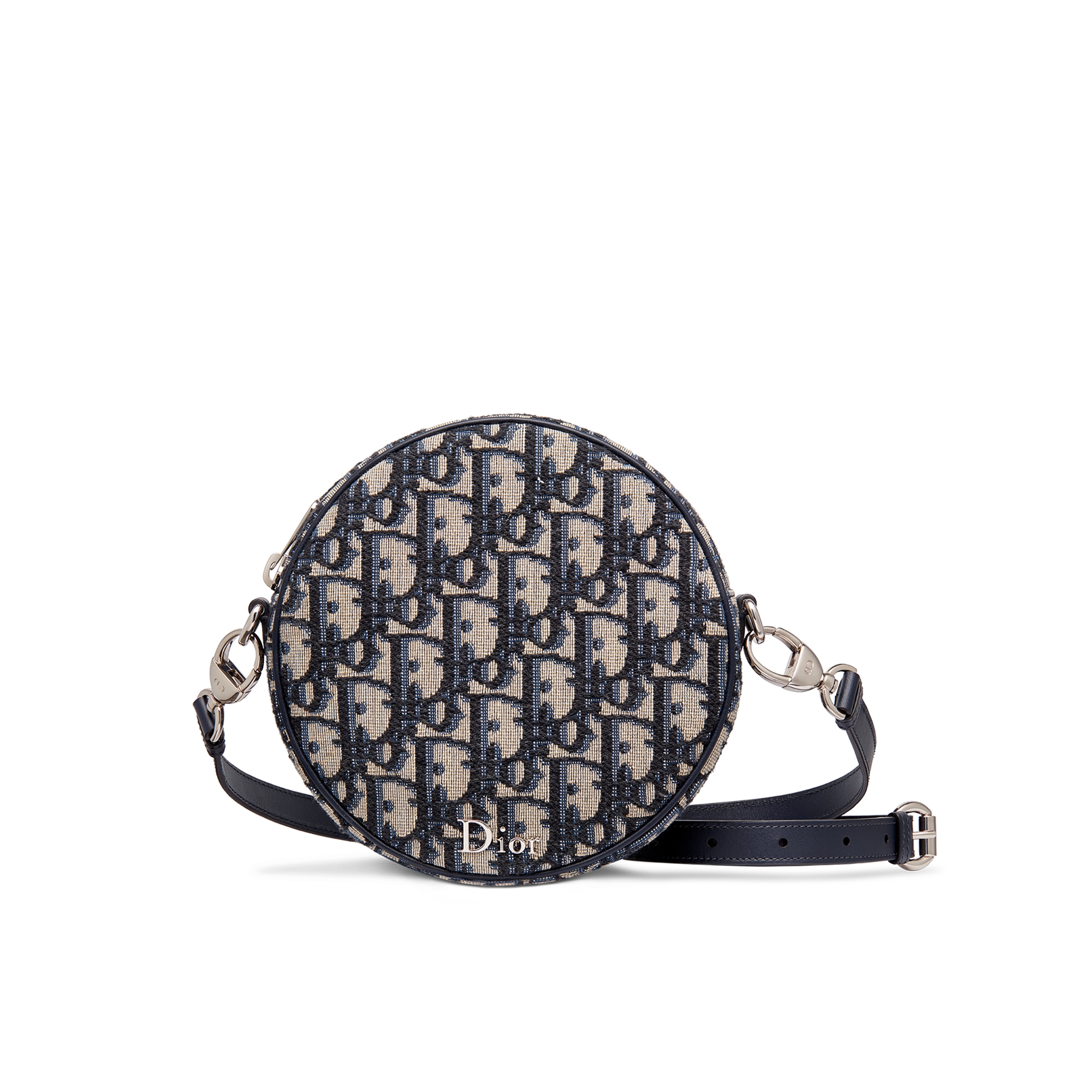 The Baby Ball bag revisits the hallmark Dior Oblique motif in a version for little girls. Crafted in beige and black jacquard, it is distinguished by its original round shape, completed by an adjustable strap in blue smooth calfskin. It features a zip closure and a small interior pocket and is adorned with a metal Dior signature on the front. An ideal daily companion, the accessory will coordinate well with any outfit.
