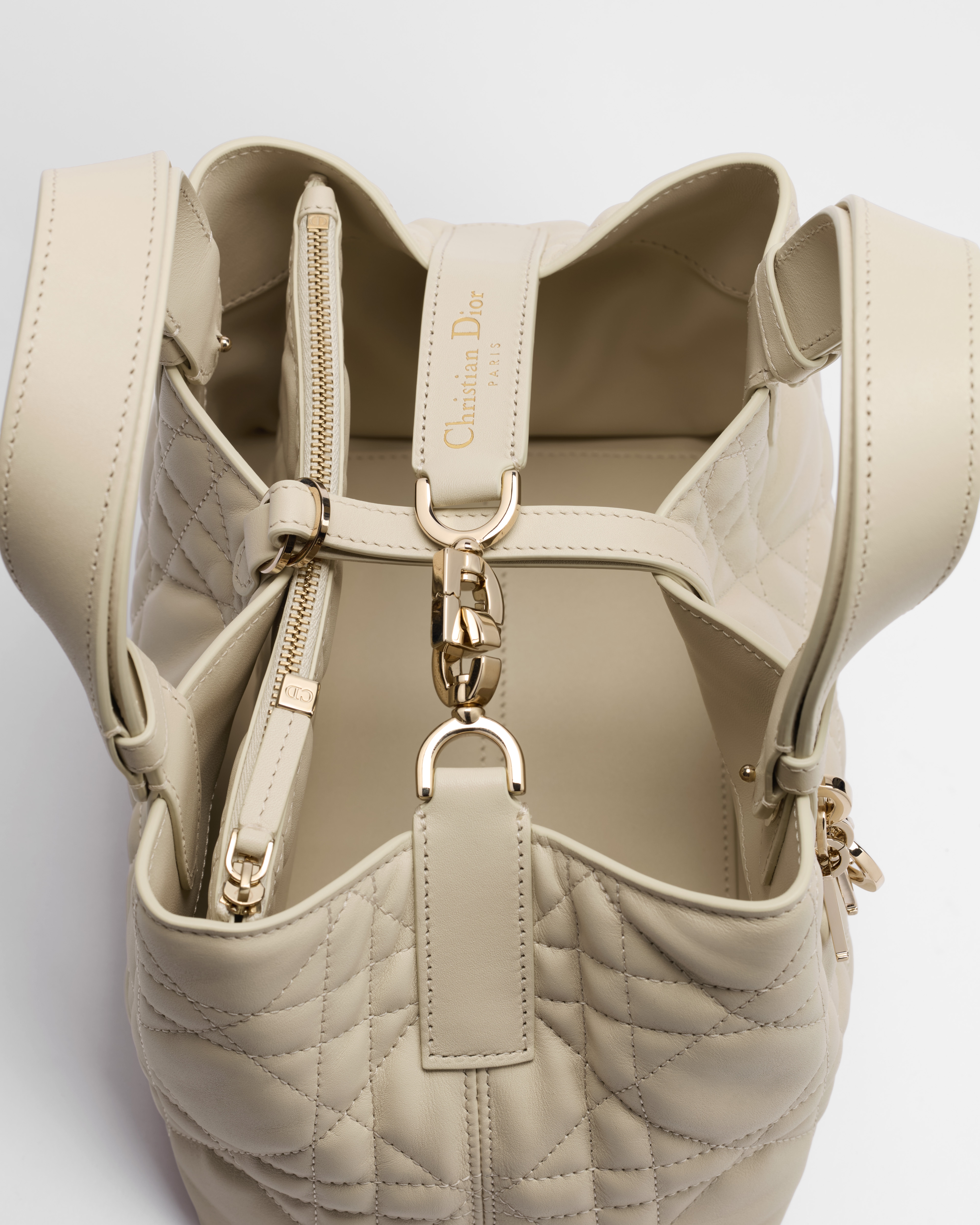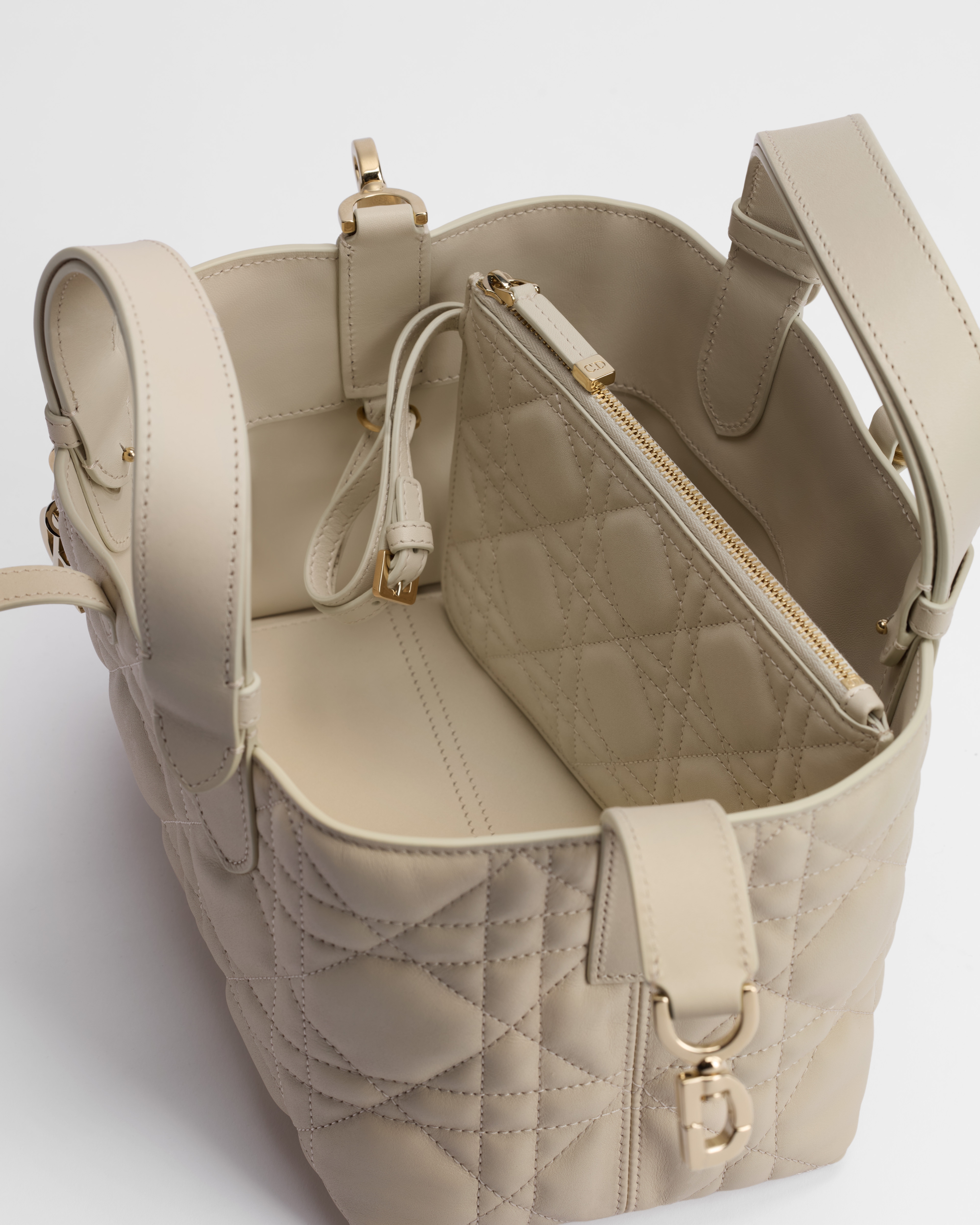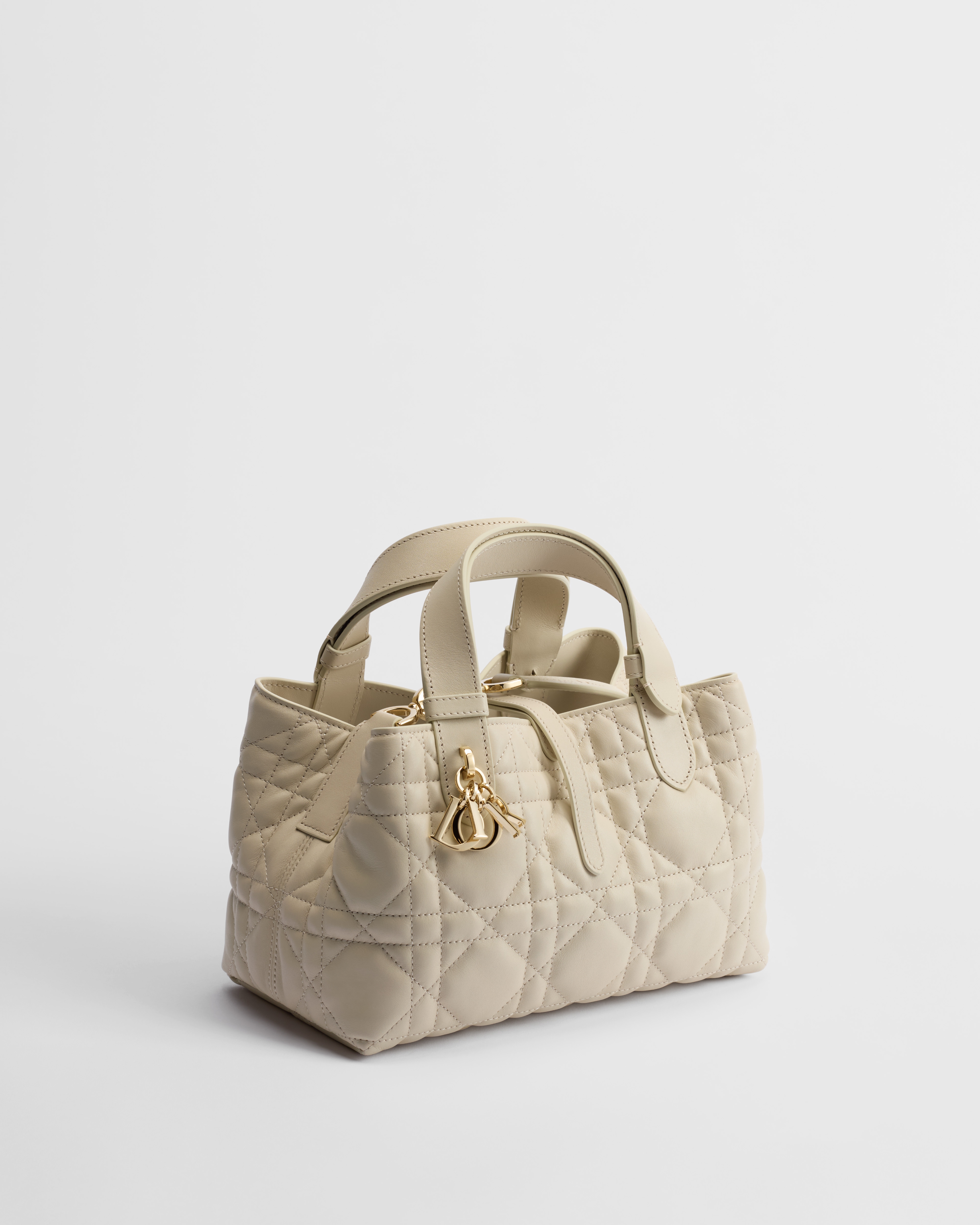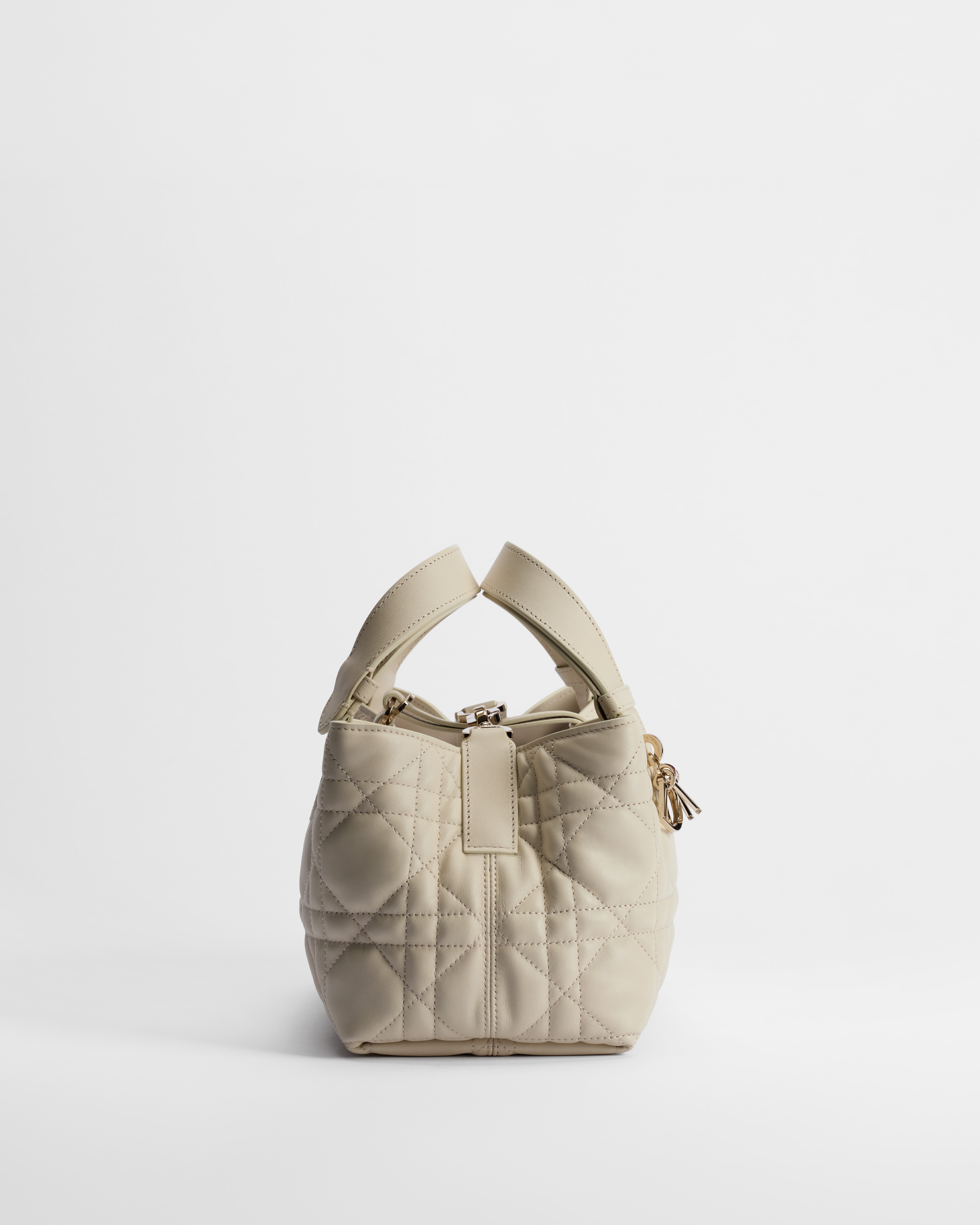The Dior Toujours bag is distinguished by a casual and practical design. Crafted in Craie beige calfskin with Macrocannage topstitching, it showcases a spacious interior compartment with a matching pouch to organize the essentials. Its thin leather strap closure keeps items secure while the D of the CD Lock clasp twists to adjust the sides and enhance the bag's silhouette. Equipped with leather top handles that can be adjusted using the small notches, the small bag can be effortlessly carried by hand.