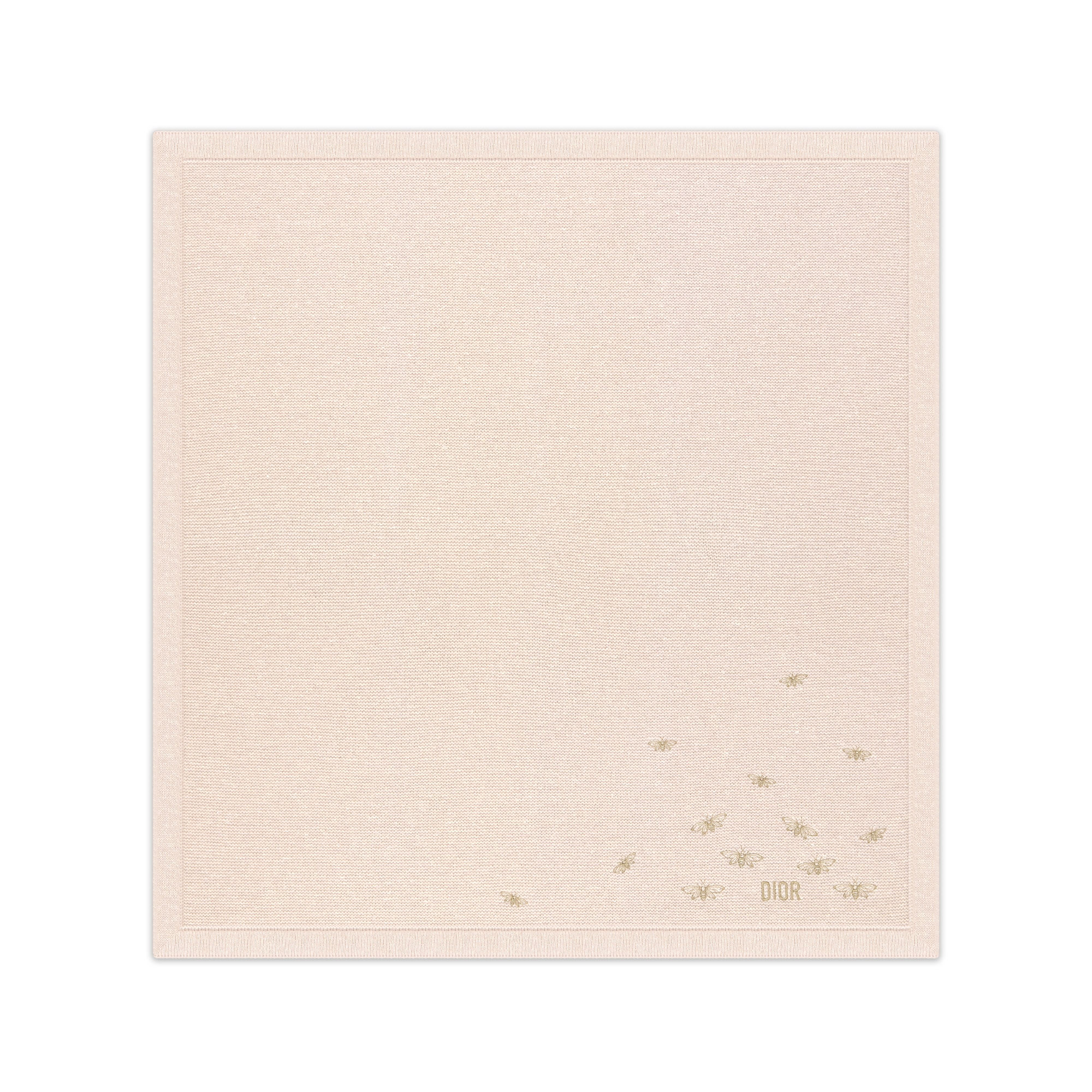 The refined blanket is knit in pale pink wool and silk mouliné adorned with the Dior embroidery surrounded by gold-tone bees on the bottom. Finished with ribbed edges, the soft blanket can be coordinated with matching pieces from the collection to complete an ideal newborn gift.