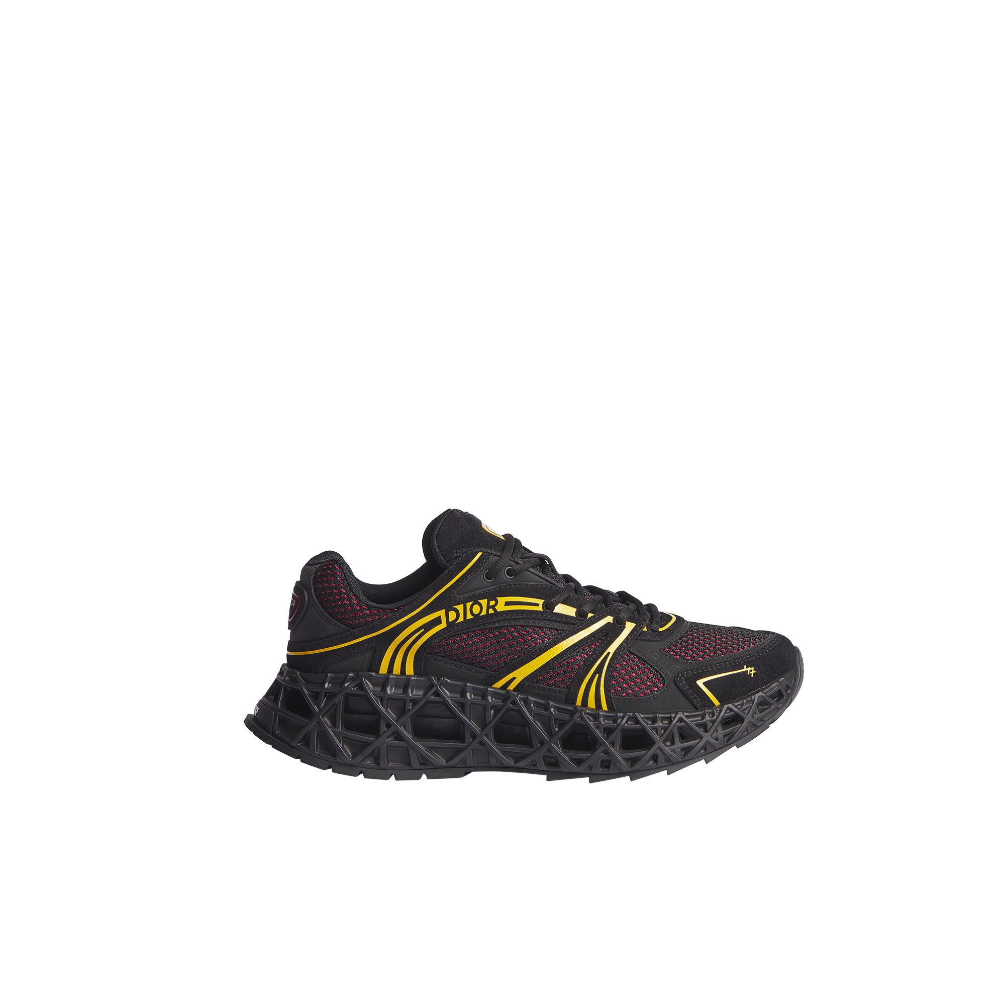 The B35 NXXT sneaker stands out with futuristic appeal. The black openwork architectural sole with the Cannage motif demonstrates the House's mastery of innovation. The sole is crafted to be voluminous yet lightweight, for remarkable stability and a silhouette with a dynamic feel. The black suede, black and yellow technical fabric and two-layer red technical mesh upper creates a subtle contrast reminiscent of a running shoe from the 1990s. The graphic lines and high-frequency Dior and 47 signatures highlight the contemporary look, while the Dior B35 patches on the tongue and heel counter add the finishing touches to the exceptional style. The sneaker will ensure optimal comfort and stability.