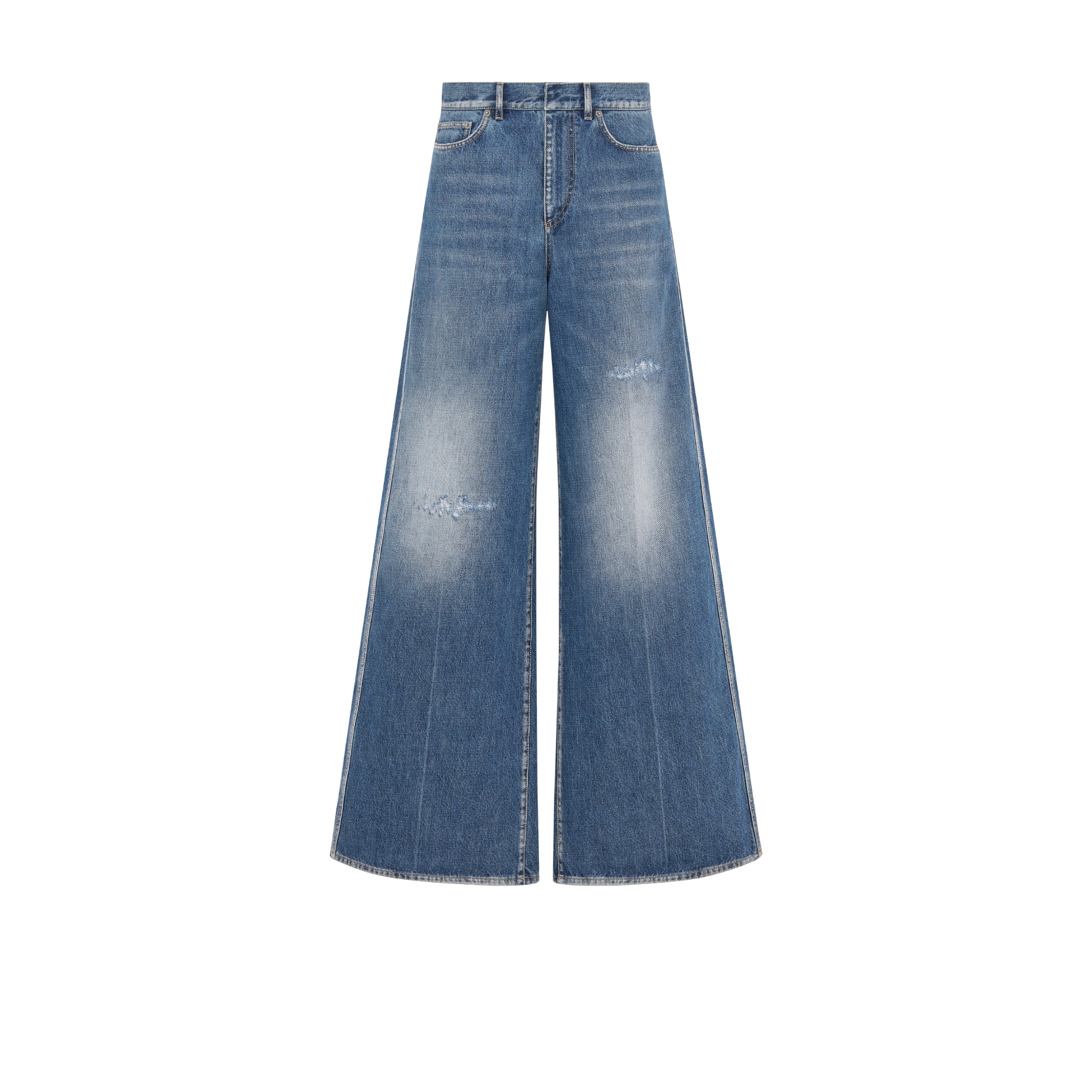 The denim pants showcase an elegant, flared cut. Crafted in blue stonewashed cotton denim, the streamlined silhouette is embellished with a Christian Dior Paris leather tag on the back. Featuring pockets on the front and back, the jeans will pair with any pieces from the Dior wardrobe, throughout any season.