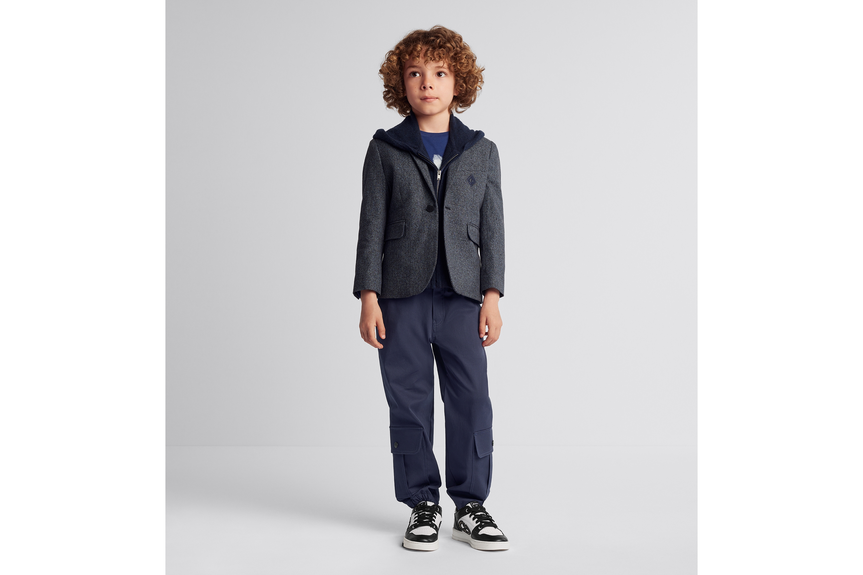 New for Winter 2024, the jacket features an original trompe-l'oeil design with a classic silhouette and modern detailing. Crafted in blue cotton gabardine with a houndstooth motif, it is equipped with a removable hooded cardigan in navy blue cashmere. The style fastens with one button and is enhanced by a CD Diamond embroidery on the front, a vent in the back and several pockets, including one on the interior. The versatile jacket can be worn separately or paired with the cardigan to create a variety of looks.