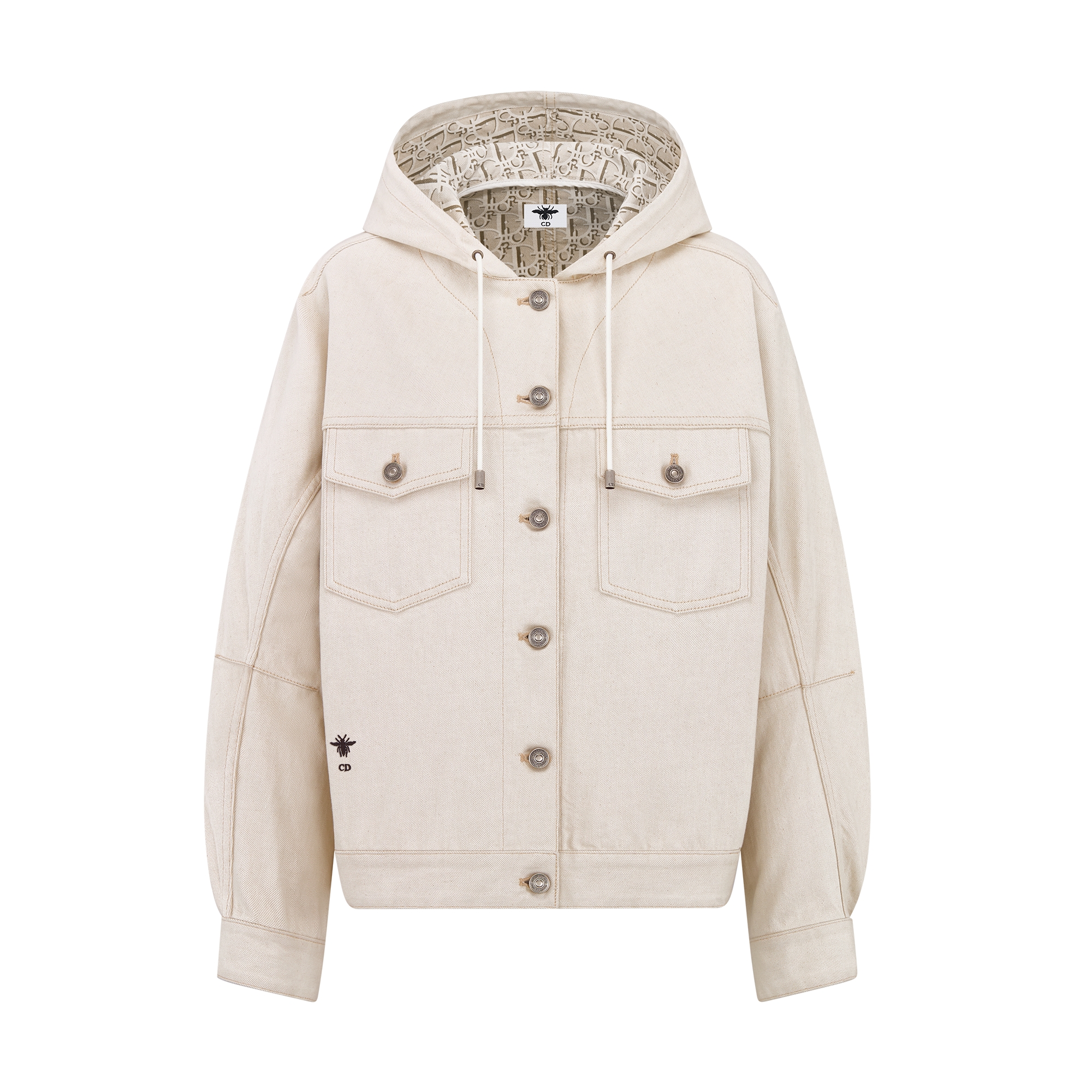 The jacket is both contemporary and timeless. Crafted in ecru cotton denim, it is characterized by its oversized hooded silhouette and features a tonal Dior Oblique motif on the interior. Its numerous patch and side pockets offer enhanced practicality. The jacket may be paired with the matching jeans for a stylish look.