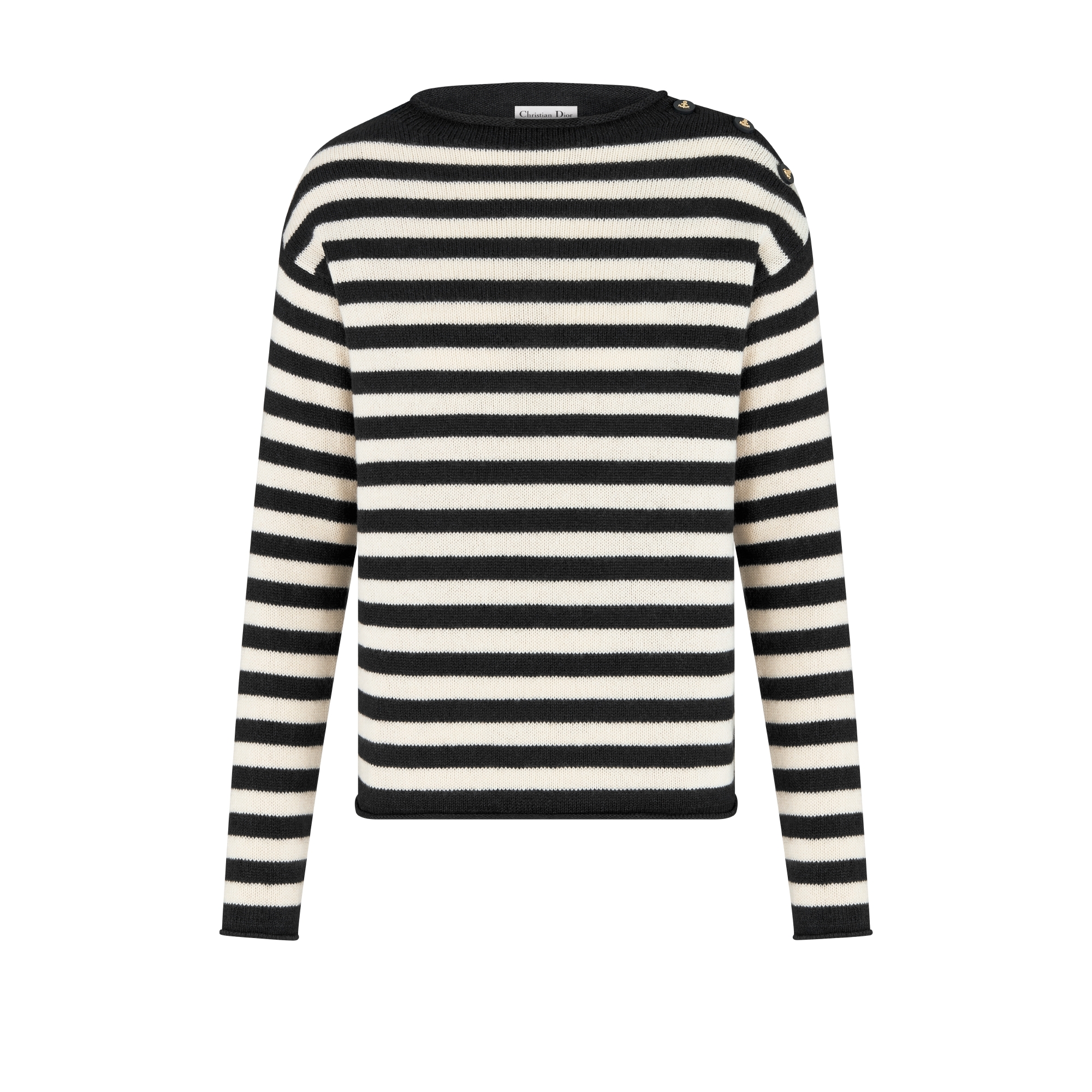 The sweater is adorned with the timeless Dior Marinière motif in black and ecru. Knit in cotton and cashmere, it has a relaxed silhouette adorned with gold-finish anchor buttons on the shoulder, while the Christian Dior signature embellishes the back. Both classic and modern, the sweater can be styled with any attire through the seasons.