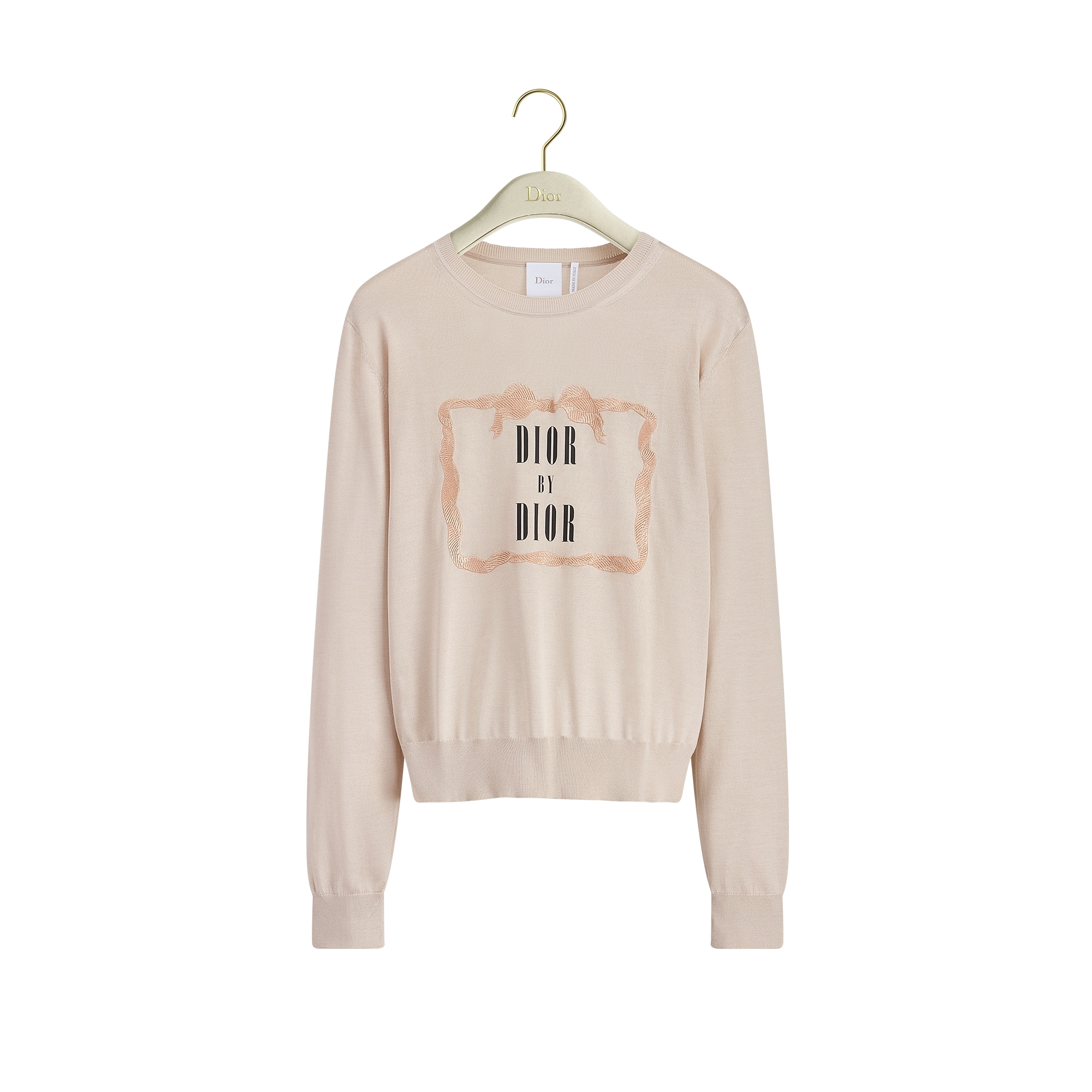 The sweater is part of Jonathan Anderson's dream library, showcasing the literary work Dior By Dior with a specially designed book cover adorned with a frame and a delicate bow, creating a modern take on 18th-century opulence. Knit in beige and black lightweight silk, it features a cropped regular fit, completed by ribbed finishes. The sweater can be paired with ensembles throughout the year.
