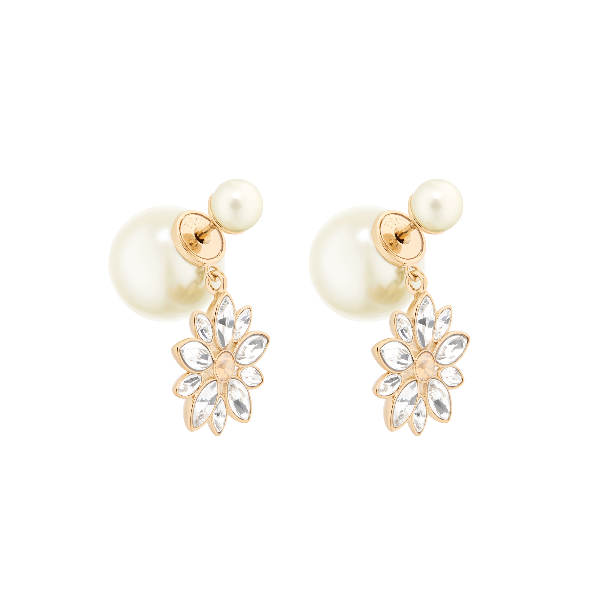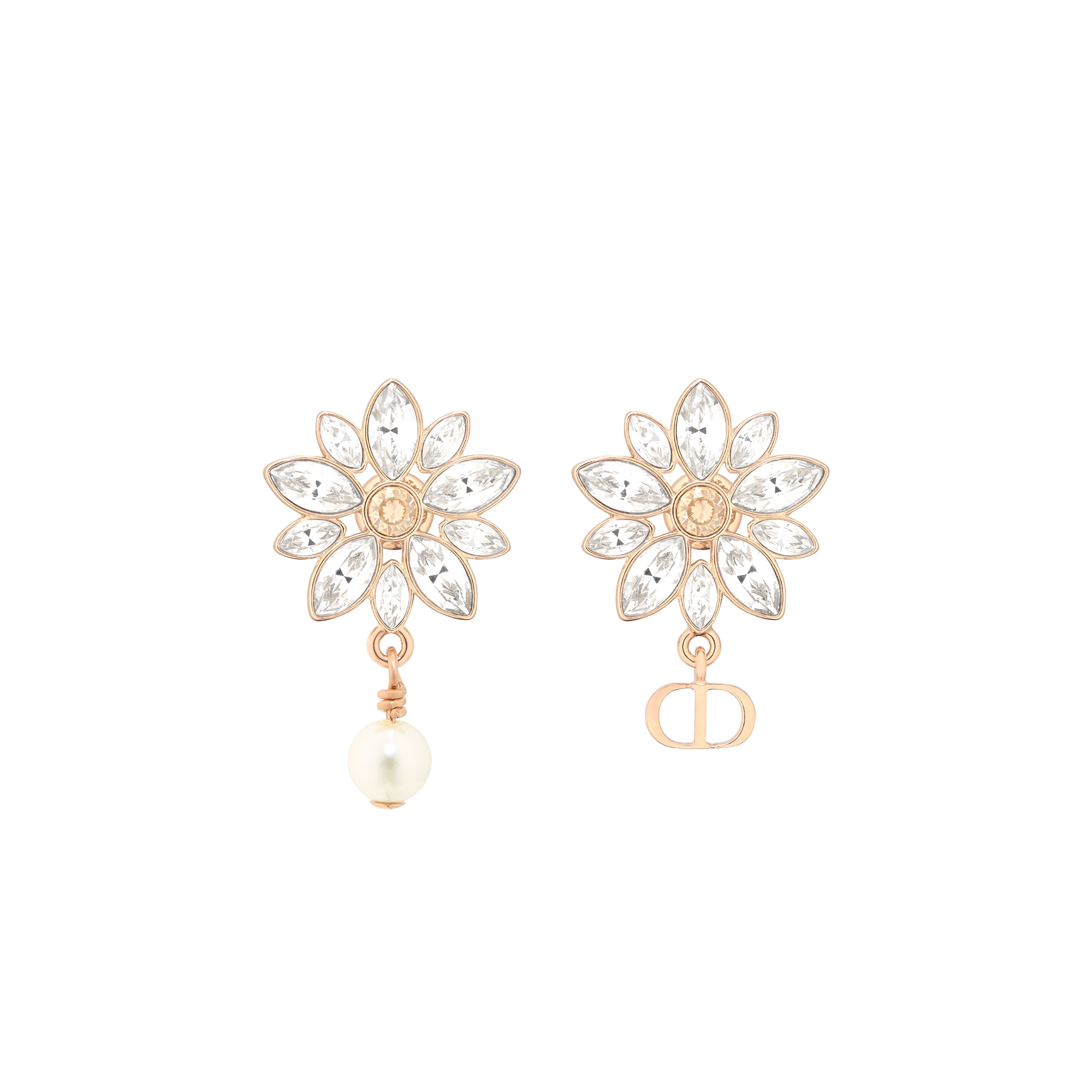 New for Cruise 2026, the Fleur de Glace earrings are a poetic and delicate creation demonstrating the House's exceptional savoir-faire. Finely crafted in pale gold-finish metal, they feature a flower with silver-tone crystal petals and a gold-tone crystal at its center. The asymmetrical design is elevated by a white resin pearl on one side and the CD signature on the other. The refined earrings can be combined with other Fleur de Glace pieces.