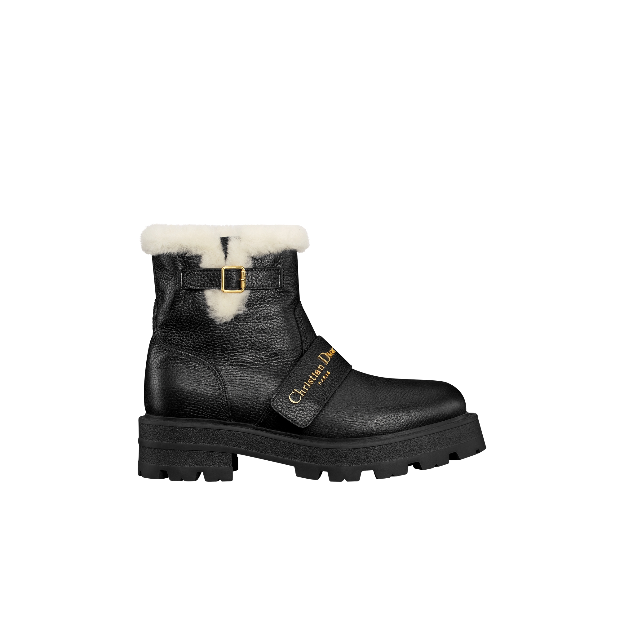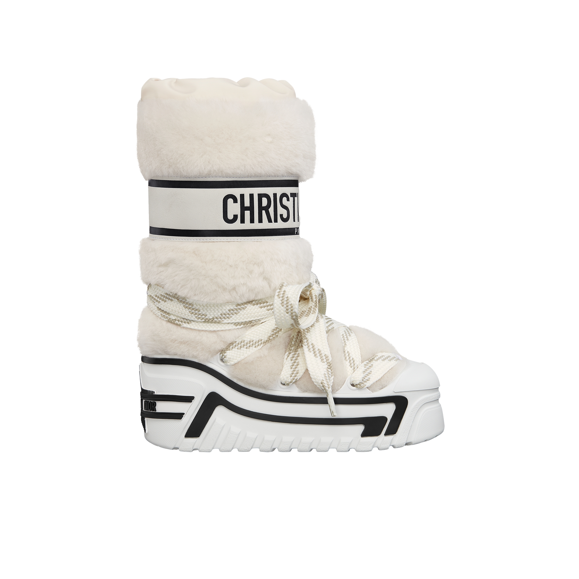 The après-ski boot, created for the DiorAlps capsule, is distinguished by its bold design. The white lambskin shearling upper is subtly contrasted by tonal suede goatskin details and two-tone laces that cross to achieve an ideal fit. The Christian Dior signature adorns the upper, as well as the thick sole with a hallmark star. Featuring a high silhouette, the technical boot will be ideal for both urban and alpine settings. It can be coordinated with other DiorAlps creations.