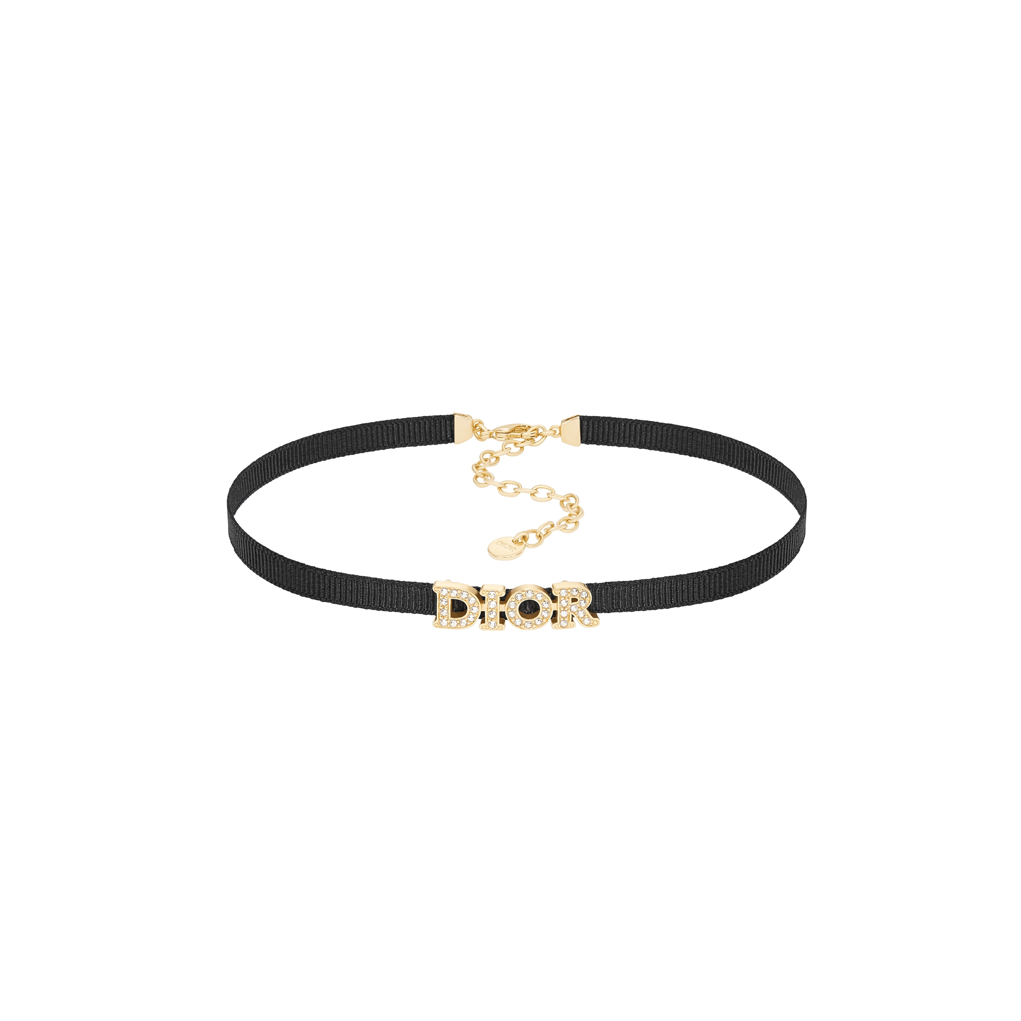 The Dio(r)evolution choker embodies timeless elegance. The black technical fabric design with a grosgrain effect showcases a gold-finish metal Dior signature pavé-set with silver-tone crystals. Offering effortless style, the necklace can be coordinated with other Dio(r)evolution creations.