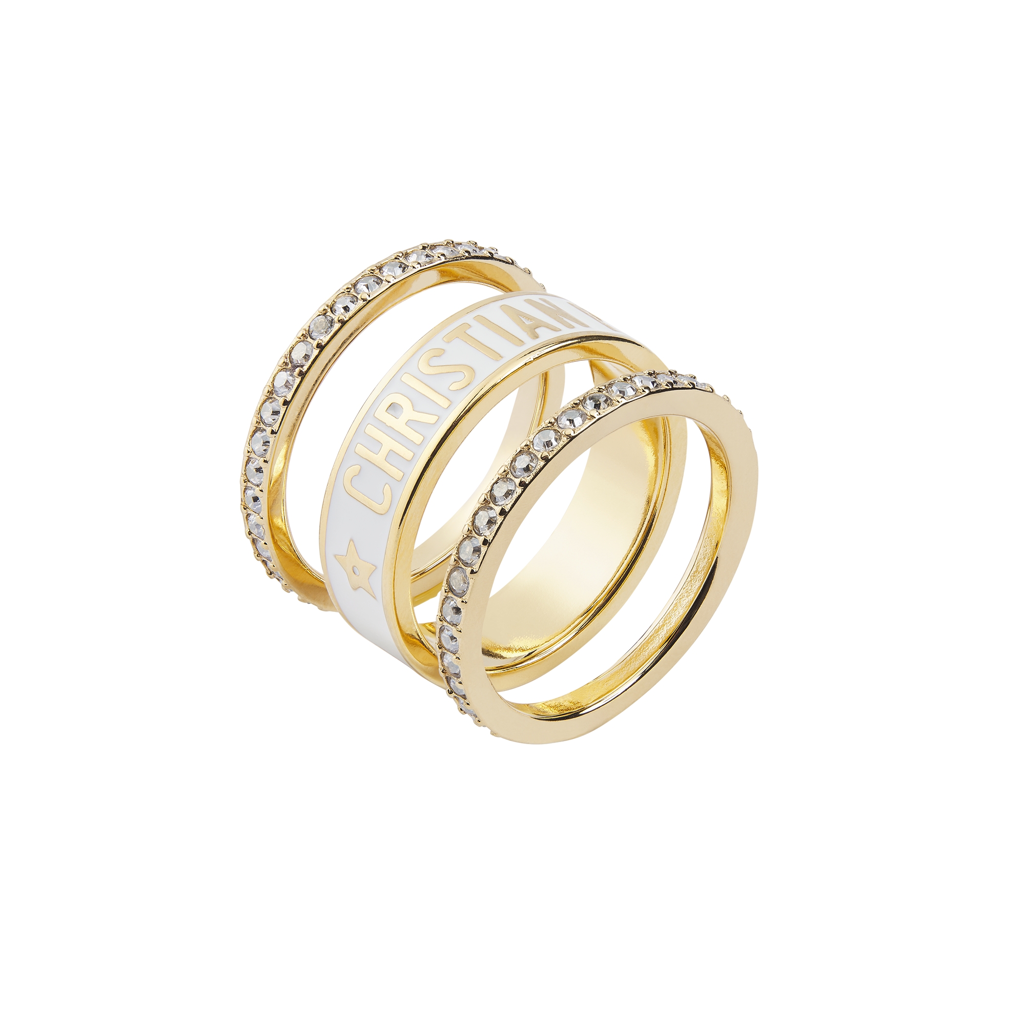 The Dior Code ring set offers a modern and iconic look. Two slender gold-finish metal rings feature a pavé of silver-tone crystals, while the third ring presents a wider silhouette in white lacquer with the Christian Dior signature. The rings can be combined with other Dior Code creations.