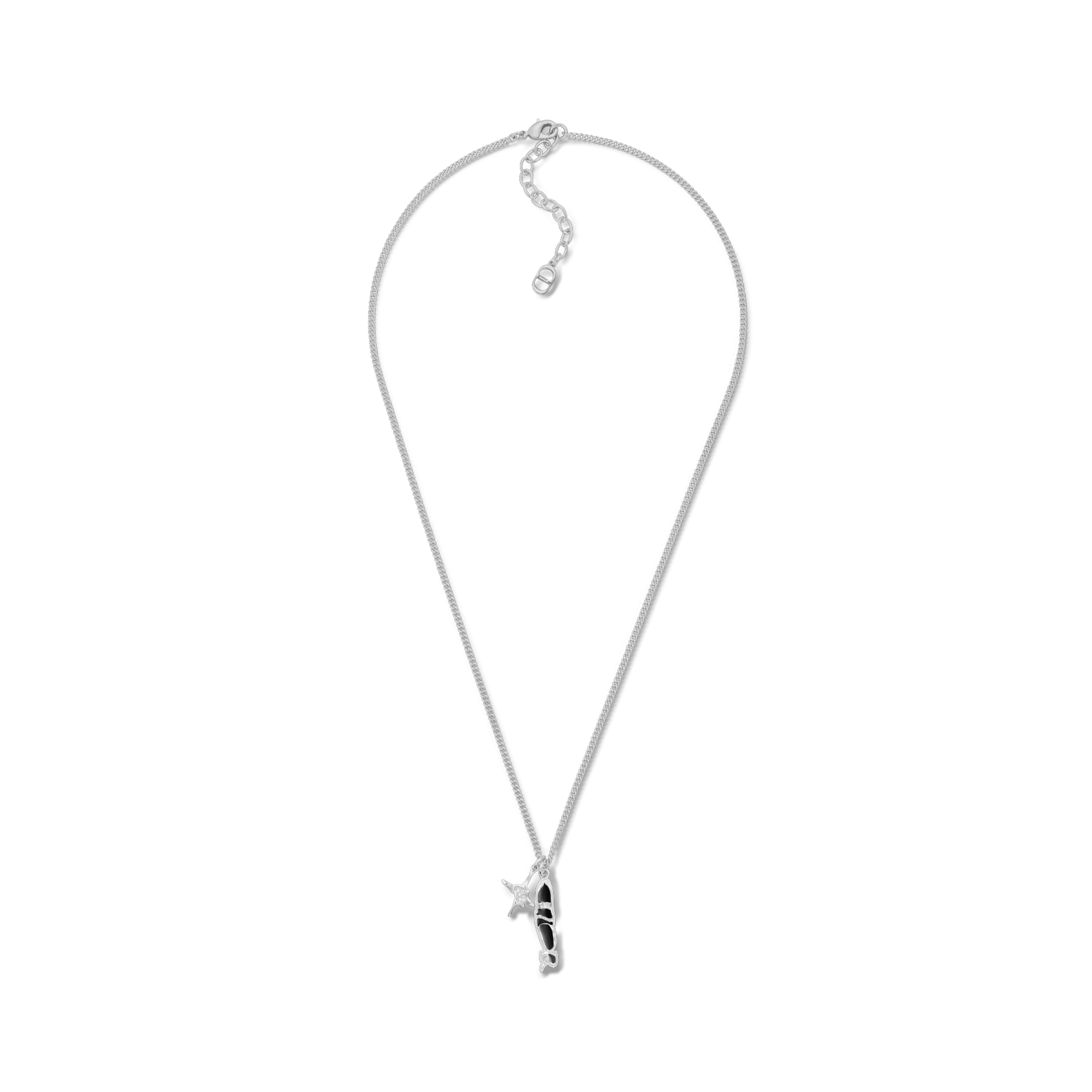 New for Spring 2025, the necklace is part of the exclusive DIOR AND LEWIS HAMILTON capsule. Crafted in silver-finish brass, it features symbol pendants from the DIOR AND LEWIS HAMILTON collaboration adorned with black resin and white crystals, offering a graphic take on the House signature. An adjustable clasp enhanced by the openwork CD Icon signature allows it to be worn at different lengths. The necklace can be worn with other creations from the capsule.