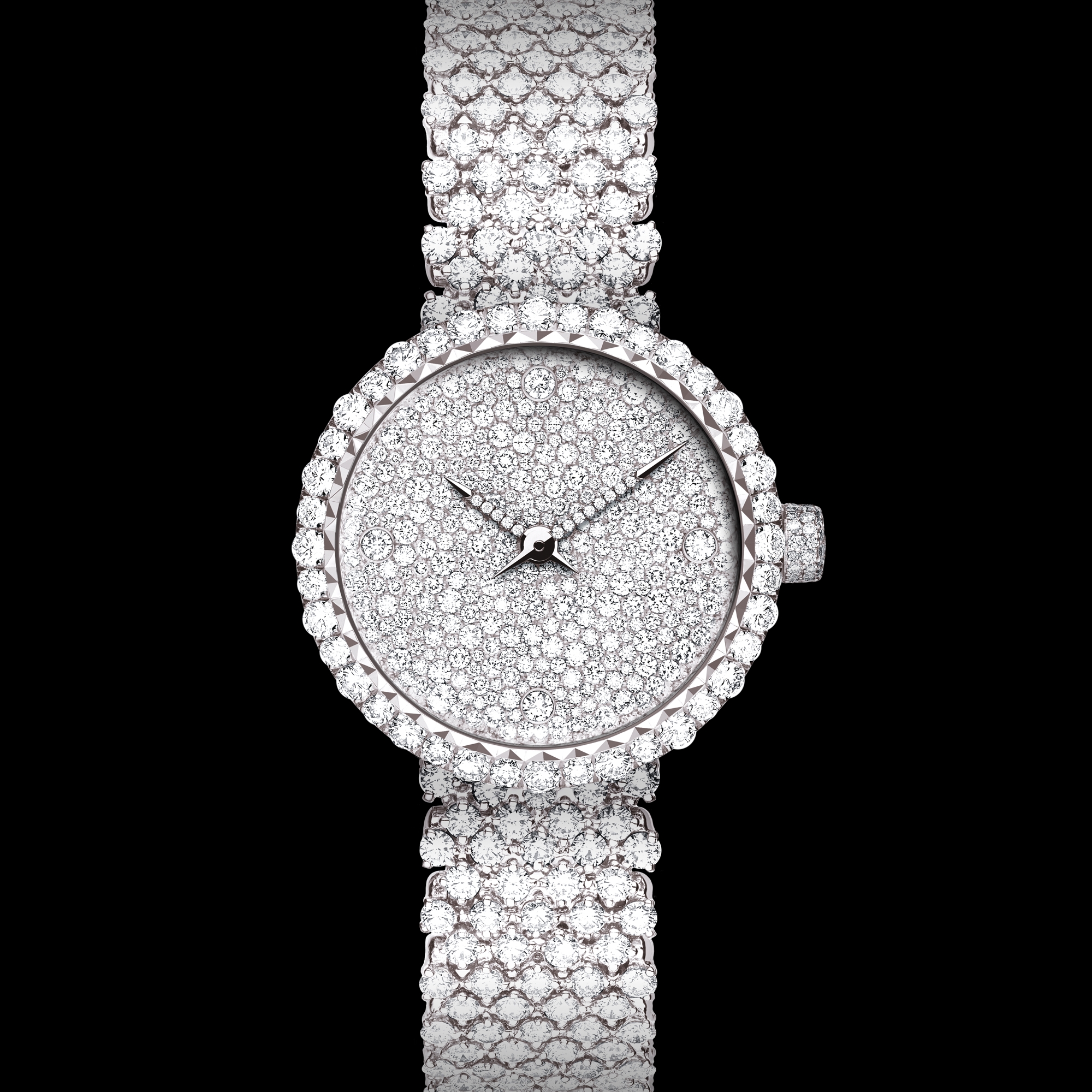 White gold dial paved with snow-set diamonds, 4 closed-set diamond hour markers, blackened hands set with diamonds