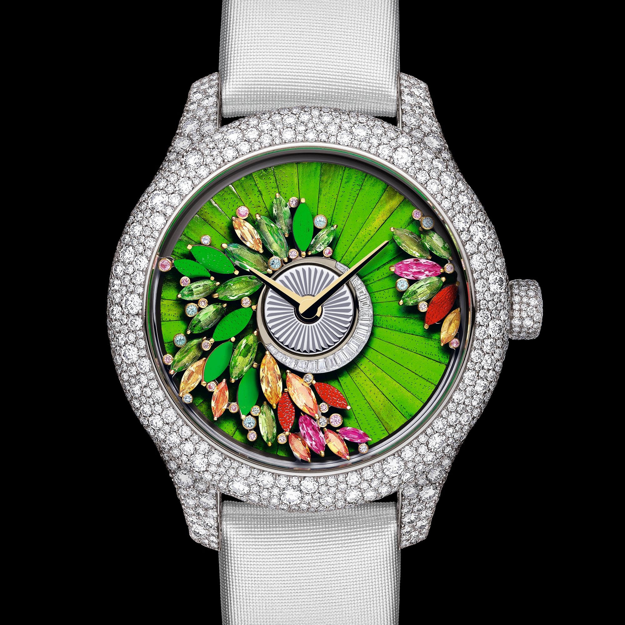 Functional oscillating weight on the dial side in white gold and pink gold, set with marquise-cut tsavorite garnets, yellow sapphires, spessartite garnets and rubies, brilliant-cut pink sapphires and apatites, baguette-cut diamonds, and scarab wings.