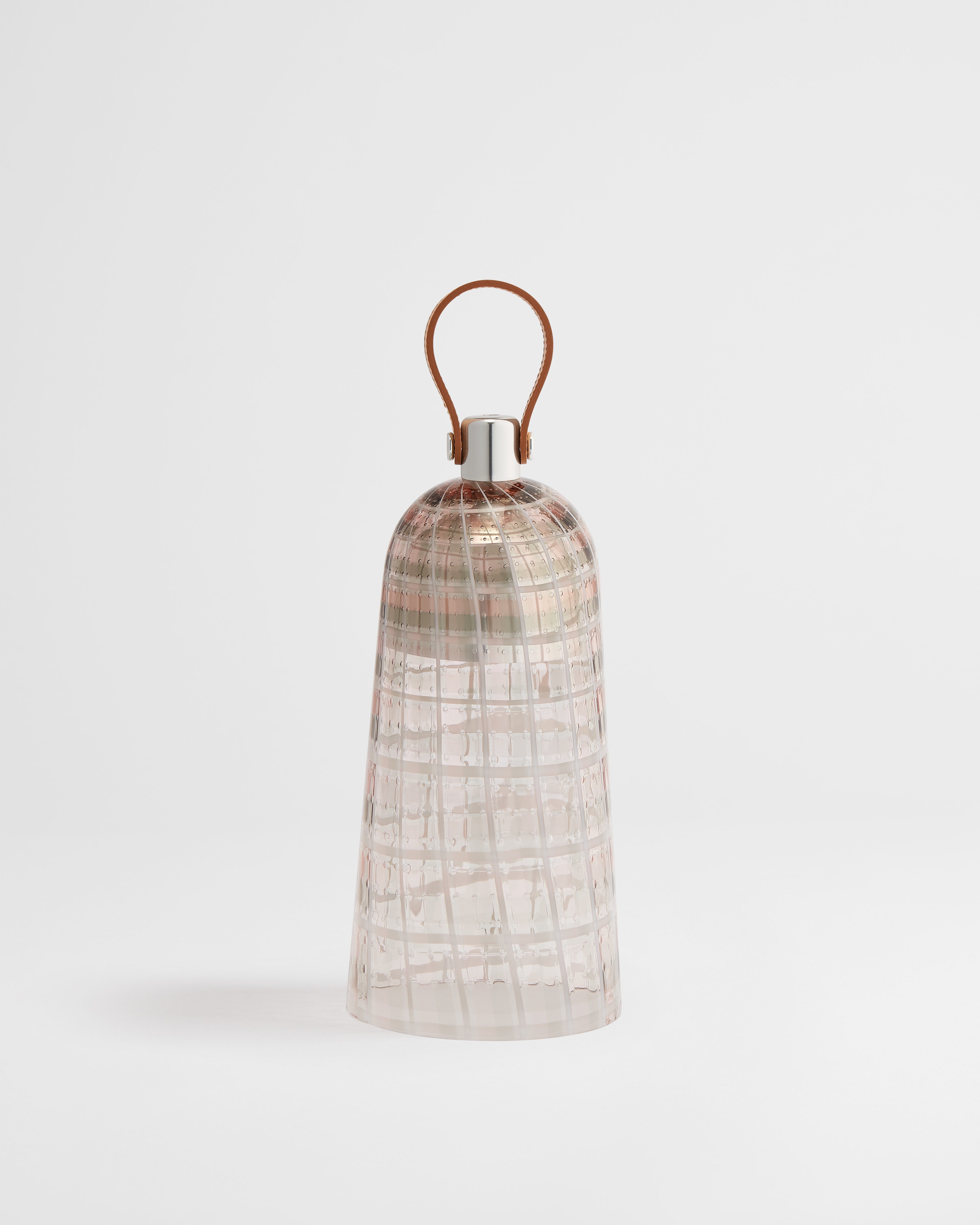 The Corolle Arlequin portable lantern, with its supple, graceful form, reinterprets the iconic lines of Mr. Dior's New Look with a fresh, bold spirit in homage to haute couture silhouettes where ingenuity meets savoir-faire. Crafted from hand-blown transparent gray and pink Murano glass with a tartan effect achieved by interweaving colored glass threads, the portable lantern with a strap showcases exceptional craftsmanship through a subtle interplay of translucency, reflections and materials. The creation will enhance any interior with a poetic touch of elegance and can be paired with other pieces from the collection for an endless variety of lighting compositions.
