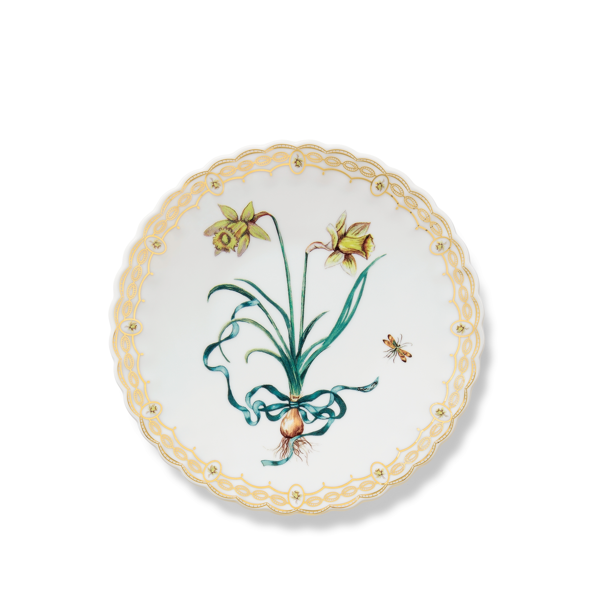 The dessert plate is part of Cordelia de Castellane's Flower Couture collection, designed as a poetic herbarium with a quintessentially Dior aesthetic. Crafted in porcelain elevated by subtle multicolor tones, the plate is adorned with a delicate daffodil flower entwined with an ethereal ribbon, and features scalloped edges decorated with 24-carat gold detailing. The dish will enhance tables with a couture touch and can be coordinated with other pieces in the Flower Couture collection for a Dior herbarium arrangement.