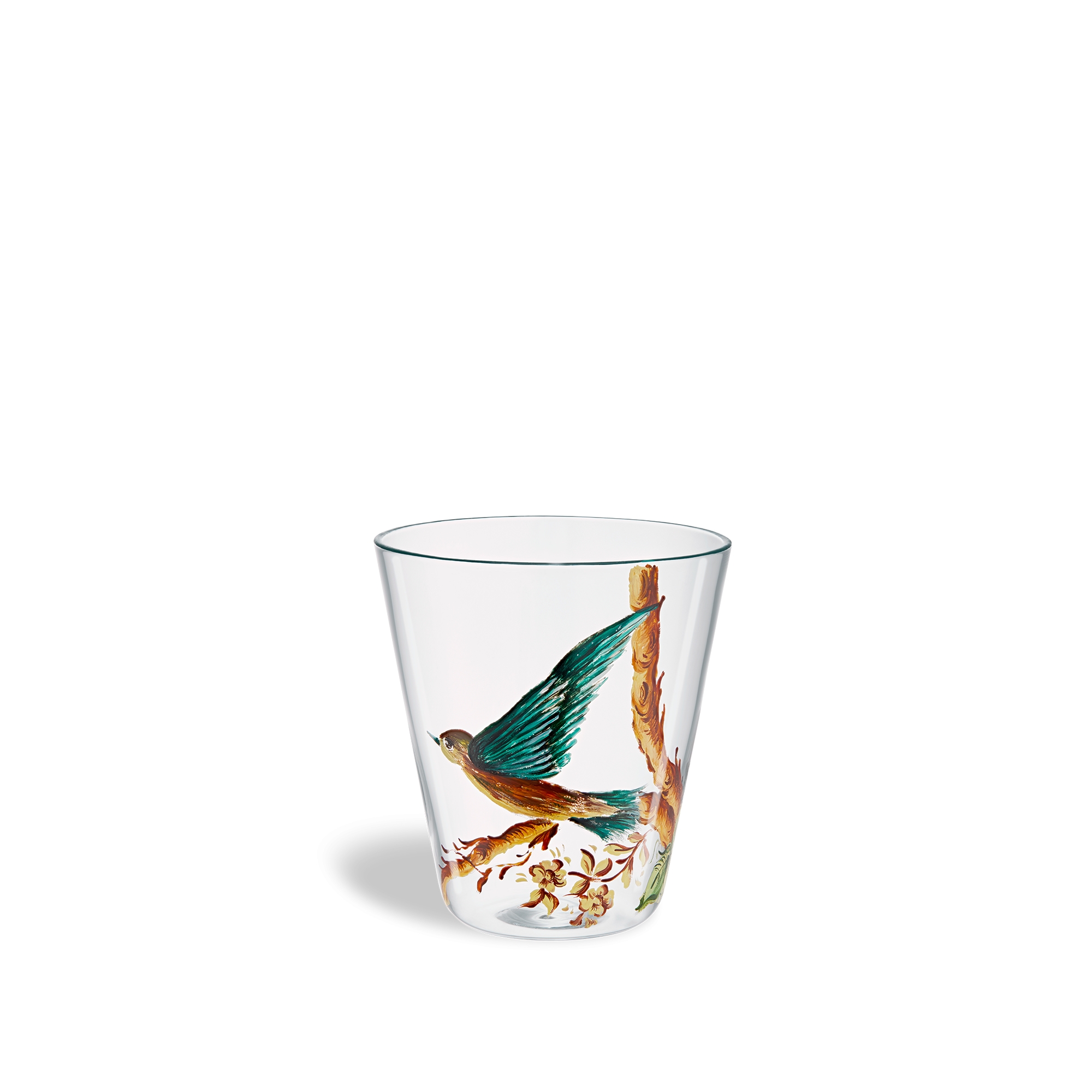 The water glass is unveiled as part of the Ranelagh collection by Cordelia de Castellane in a poetic reinterpretation of Mr. Dior's winter garden wall mural, paying rich homage to the many examples of House savoir-faire. Crafted in hand-blown glass, the water glass is painted by hand with a multicolor bird motif. An exceptional piece, it will add a touch of elegance to any table and can be coordinated with other pieces from the Ranelagh collection for a timeless ode to nature.