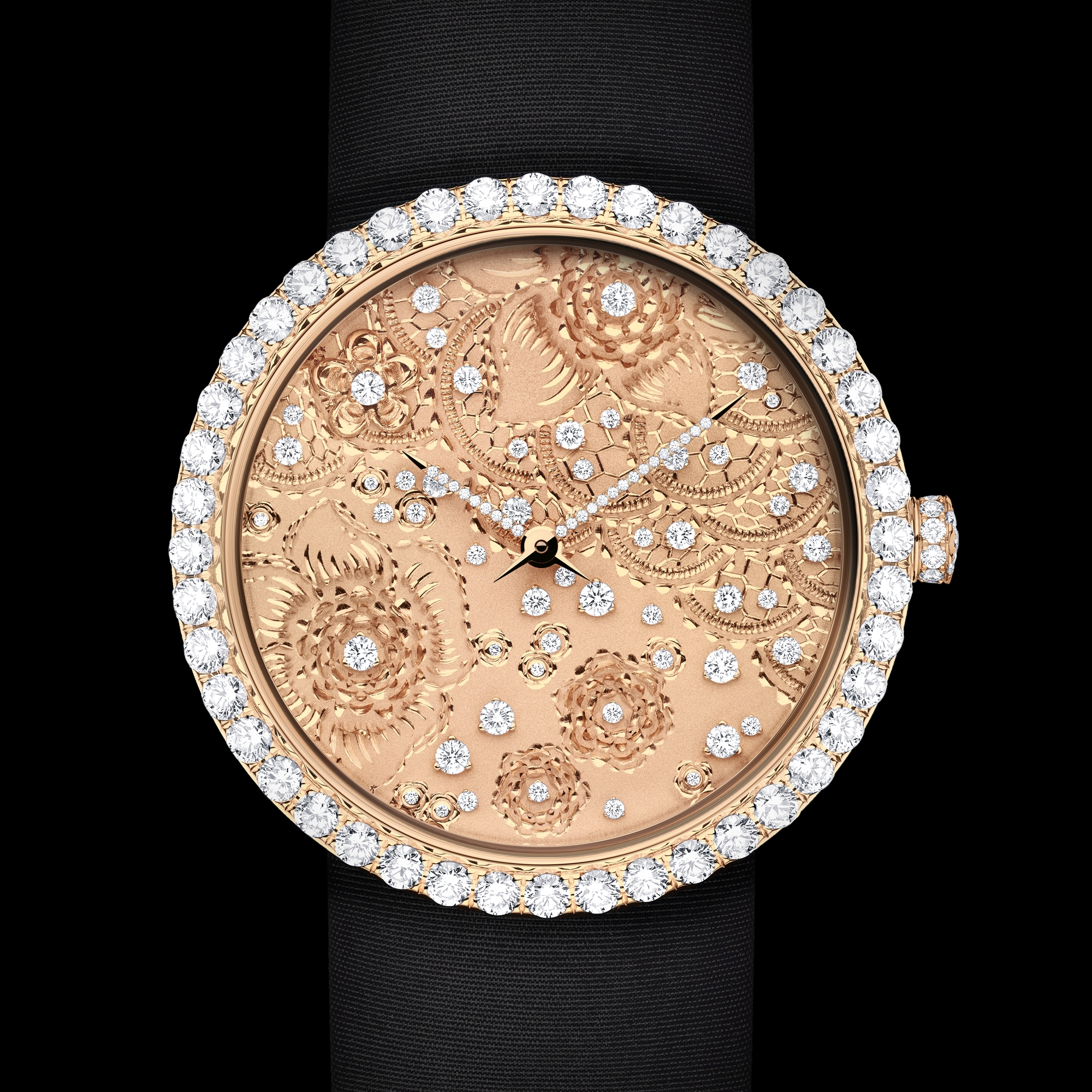 Matte pink gold dial, hand-engraved in relief and set with diamonds, pink gold hands set with diamonds.