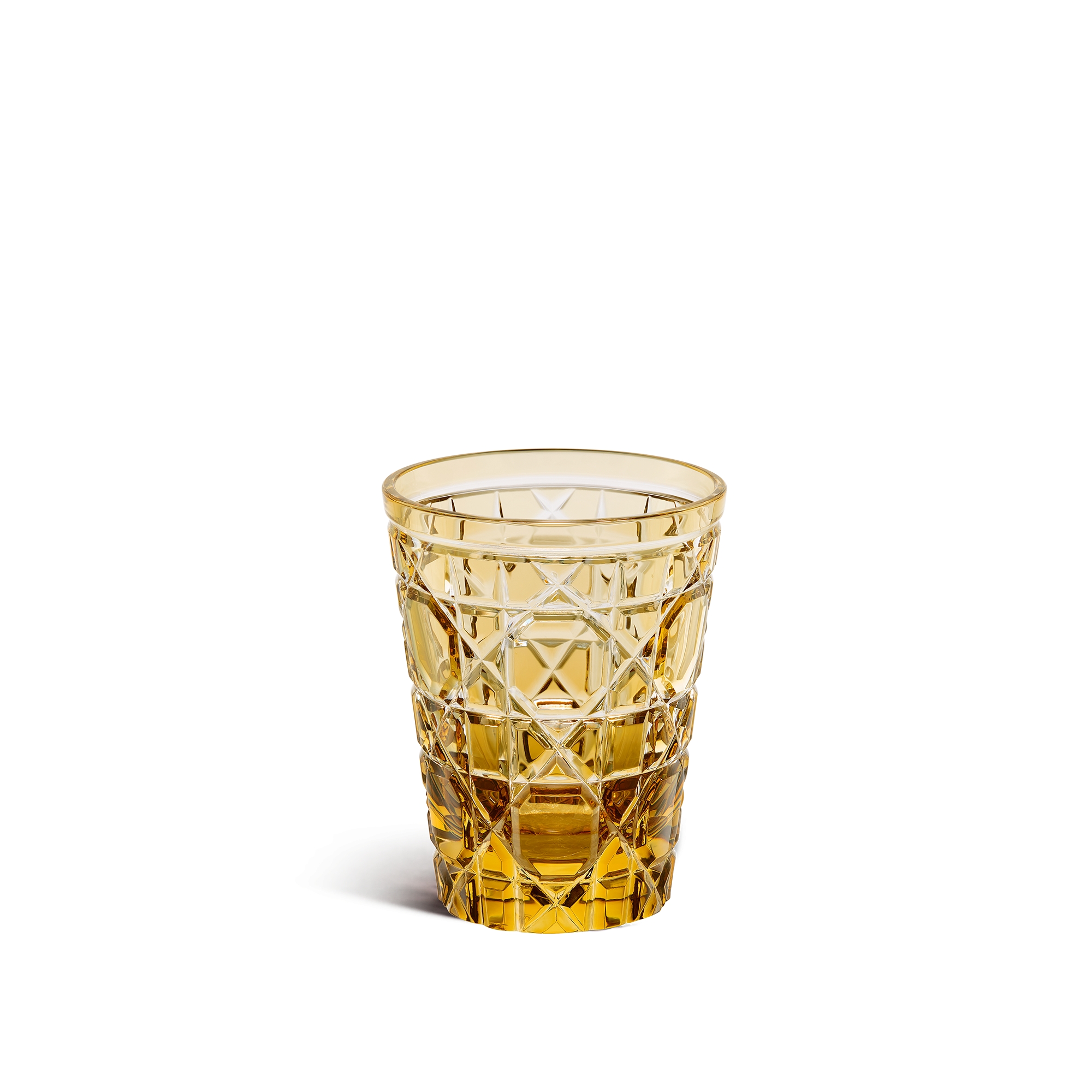 Amber-colored crystal water glass with hand-engraved Cannage motif. At each one of his shows, Christian Dior would always seat his guests on elegant Napoleon III-style chairs in the 30 Avenue Montaigne sitting rooms. The chairs were adorned with Cannage, a graphic code that's become a House symbol.