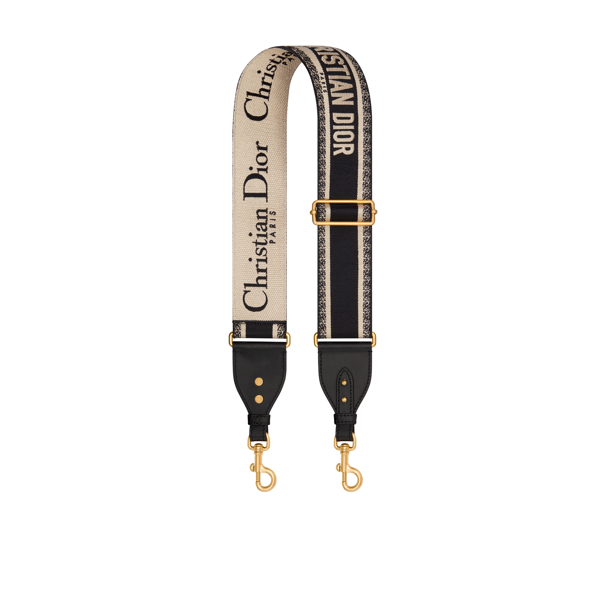 The embroidered shoulder strap is a unique accessory that allows the customization of certain House bags, available in a wide, adjustable version. The Christian Dior Paris signature is featured at the center of the silhouette and is framed by black calfskin on either side. Two antique gold-finish metal snap hooks attach the strap to the bag of choice, while the clever addition of a metal ring provides the option to carry along small leather goods from the collection. The black strap may be worn over the shoulder or crossbody for a highly personalized look.
